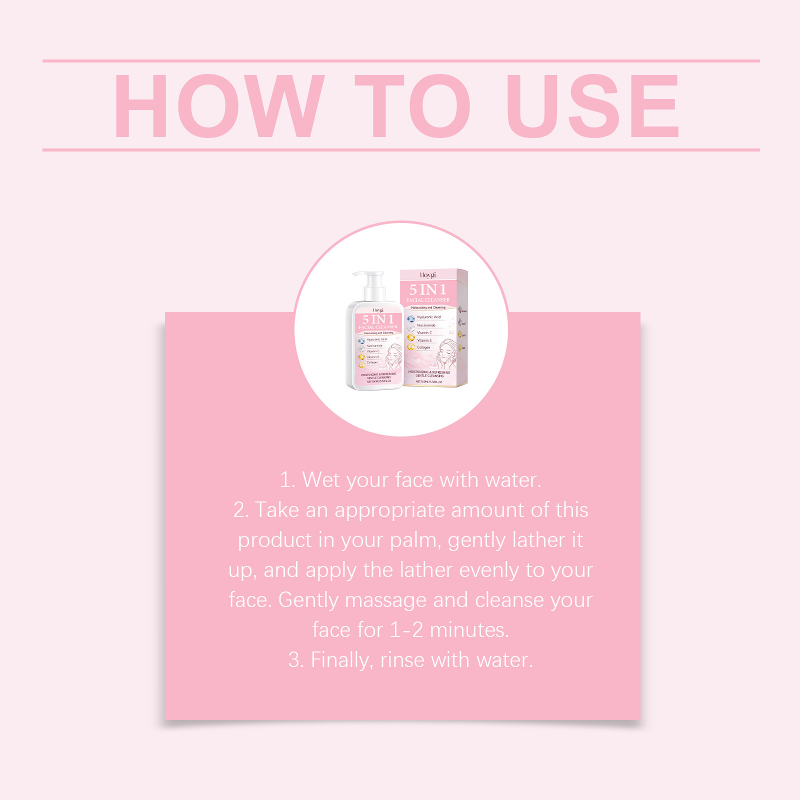 我们的五合一保湿洁面乳,由生育酚(维生素E)、水解胶原精心调配而成。专为温和净肤,水润不紧,洗卸兼顾,肤感柔滑设计。使用方法极为便捷:1.用清水湿润面部肌肤。2.取适量本品于手掌,轻轻搓出泡沫,将泡沫均匀涂抹在面部肌肤,轻柔按摩清洁面部肌肤1-2分钟。3.最后用清水洗净即可。并且它可以清洁焕亮,舒缓舒适,绵密泡沫,轻净毛孔。