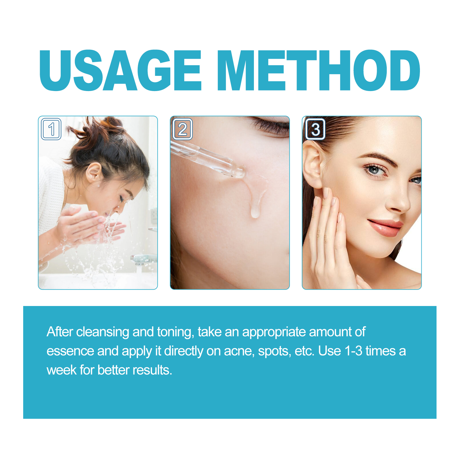 我们的水杨酸去角质精华液含有马齿苋提取物、茶树油、山茶花提取物。它可以帮助疏通毛孔,使皮肤看起来更清晰,更健康,控制水油平衡,保持肌肤状态的稳定,消除粉刺和青春痘。它的使用方法很简单:洁面后,取适量精华液直接涂抹于痘痘、斑点等部位,每周使用1-3次,效果更佳。促进细胞更新,减少过多的油脂产生,从而消除痤疮,减少黑头的产生,使皮肤光滑均匀。