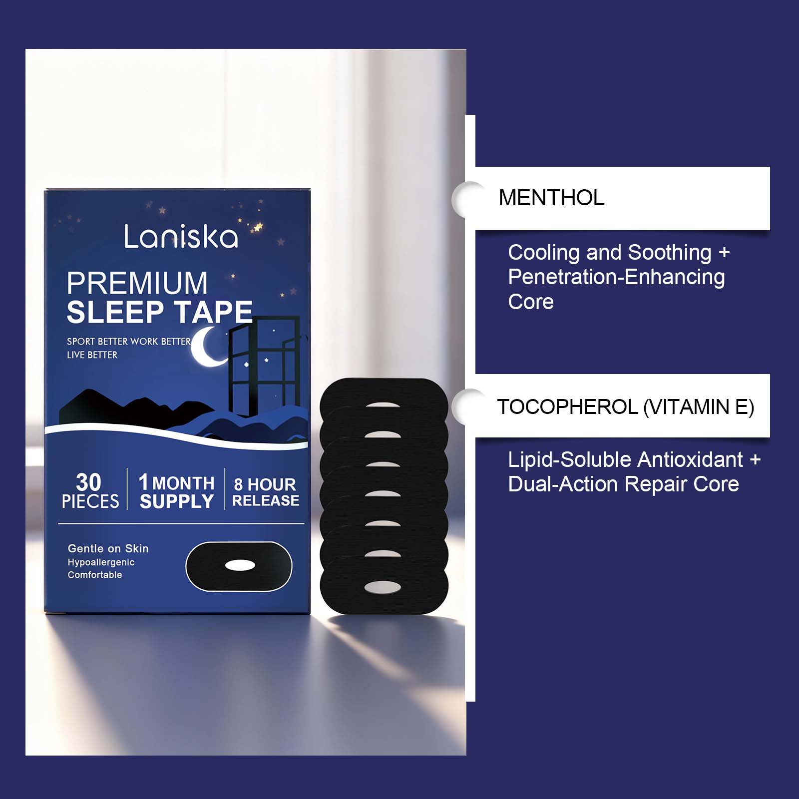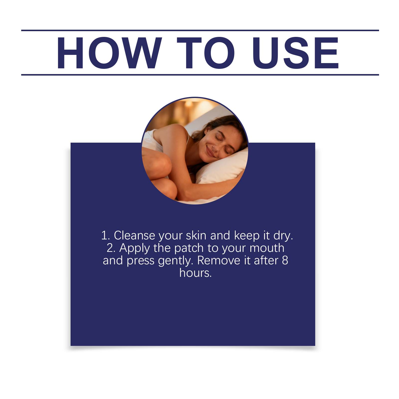 我们的睡眠护理贴片,由矿油、蜂蜡精心调配而成。专为成人睡眠支持需求设计,支持睡眠后精力充沛的感觉。使用方法极为便捷:1.清洁皮肤并保持干燥。2.将贴片贴在嘴上并轻轻按压。8小时后取下。并且它可以迅速作用于皮肤表面,缓解灼热、瘙痒和刺痛感。