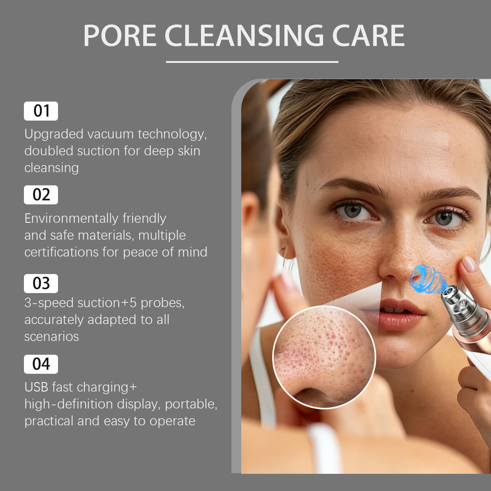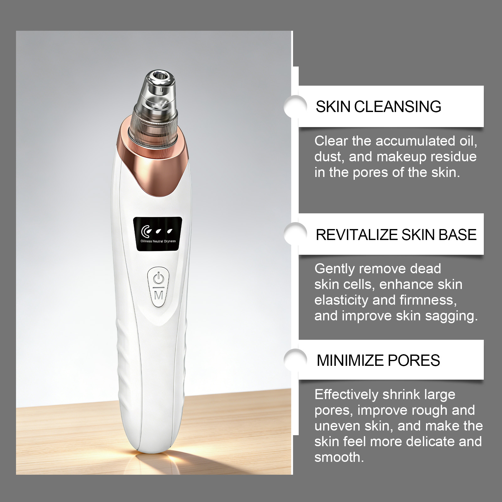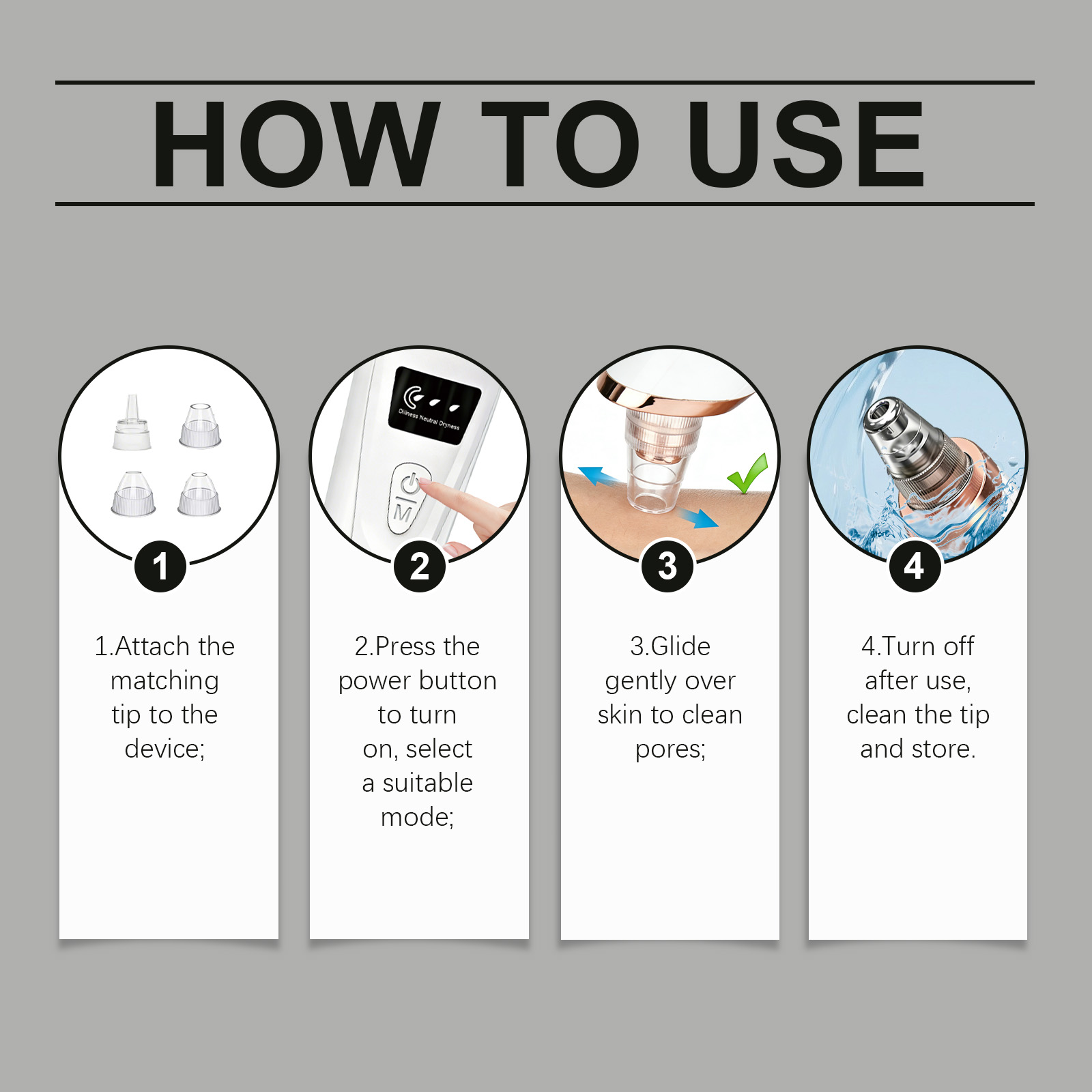 我们的毛孔清洁护理仪,由ABS+聚合物锂电池+气泵精心制作而成。专为有助于去除死皮细胞,促进血液循环,并增强皮肤弹性设计。使用方法极为便捷:1.选对应吸头装在仪器上;2.按电源键开机,选择合适模式;3.贴合皮肤轻移仪器清洁毛孔;4.用后关机,清洁吸头后存放。详情请看说明书。并且它采用创新真空技术,具有出色的吸力,实现温和无损的深层清洁。