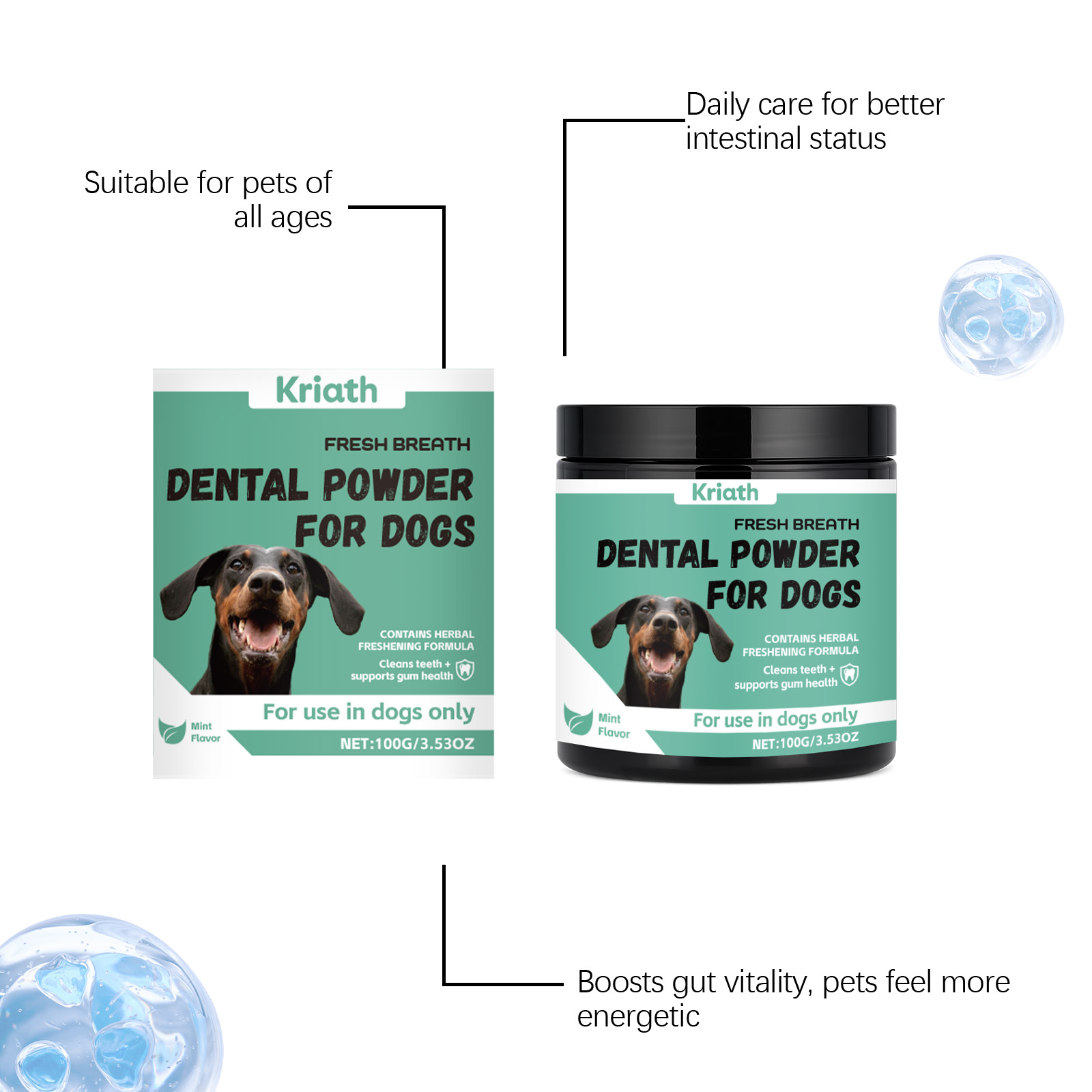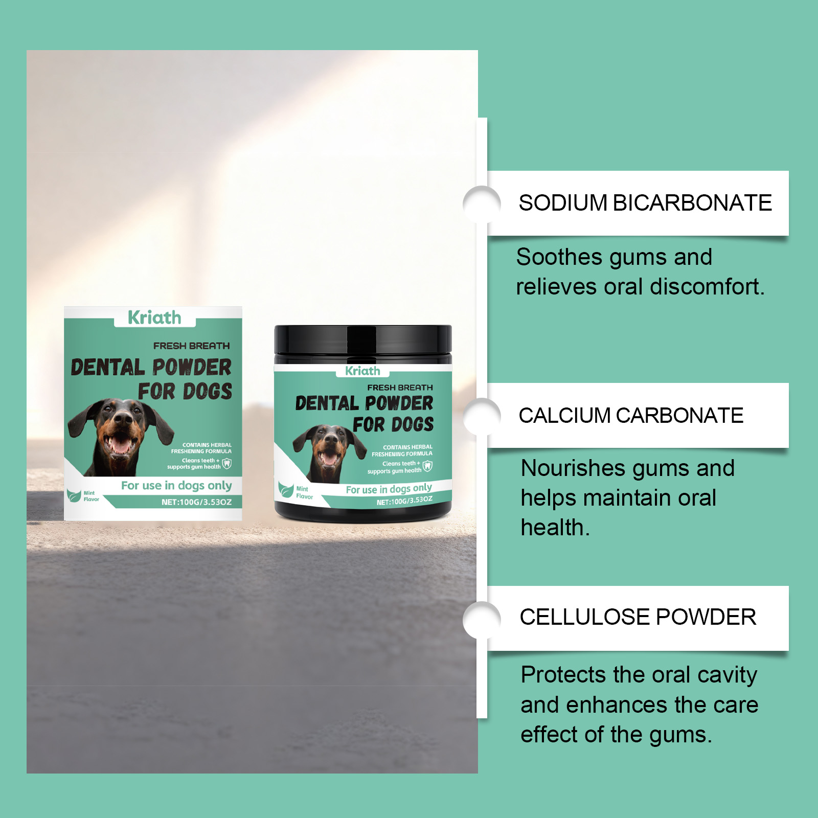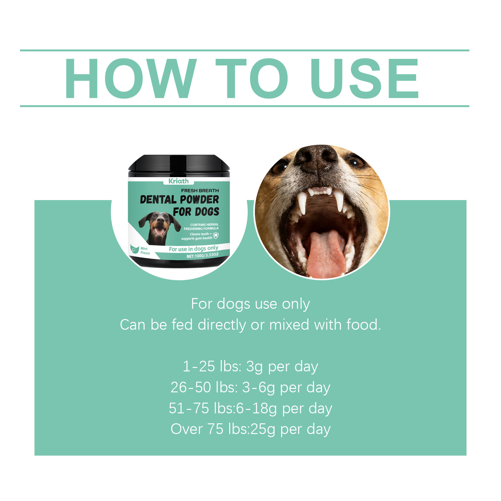 我们的狗狗专用口气清新牙粉,由叶绿素、芽孢杆菌精心调配而成。专为维持宠物肠道菌群设计。使用方法极为便捷:仅限犬类使用,可直接喂食或与食物混合。1-25磅:每天3克;26-50磅:每天3-6克;51-75磅:每天6-18克;超过75磅:每天25克。并且可以改善肠道腹泻和便秘。