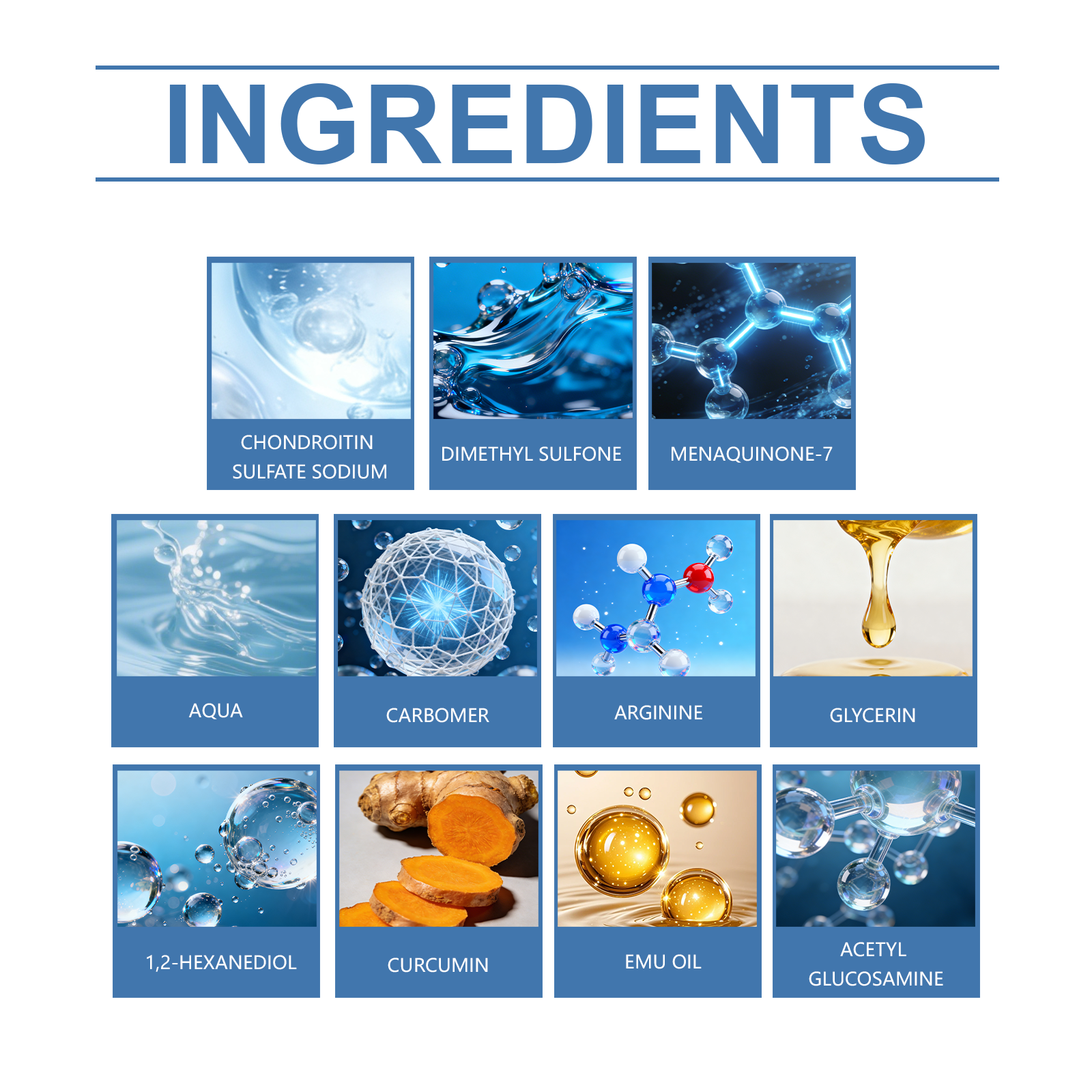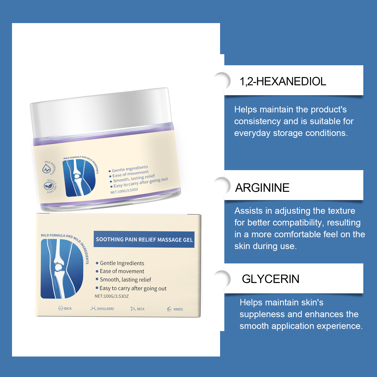 我们的关节按摩凝胶,由硫酸软骨素钠、二甲基砜精心调配而成。专为快速缓解关节疼痛,减轻不适设计。使用方法极为便捷:1.清洁并擦干皮肤。2.将适量产品均匀涂抹于所需部位,如背部、肩部、颈部和膝盖。3.轻轻按摩至吸收。并且具有长效配方,持续缓解疼痛,全天候关节保护。