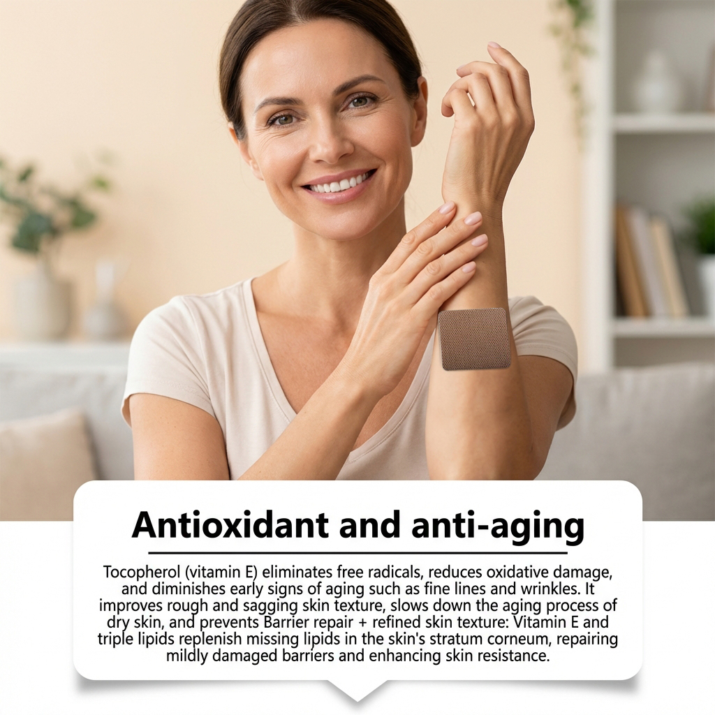 我们的草本护理贴片,由生育酚(维生素E)、库拉索芦荟提取物精心调配而成。专为缓解红、干痒及灼痛不适感设计。使用方法极为便捷:清洁并擦干皮肤。将贴片贴在手臂上并轻轻按压。8小时后移除。并且可以调节皮肤的微生态平衡,降低敏感复发的几率,适用于屏障较为脆弱的皮肤。