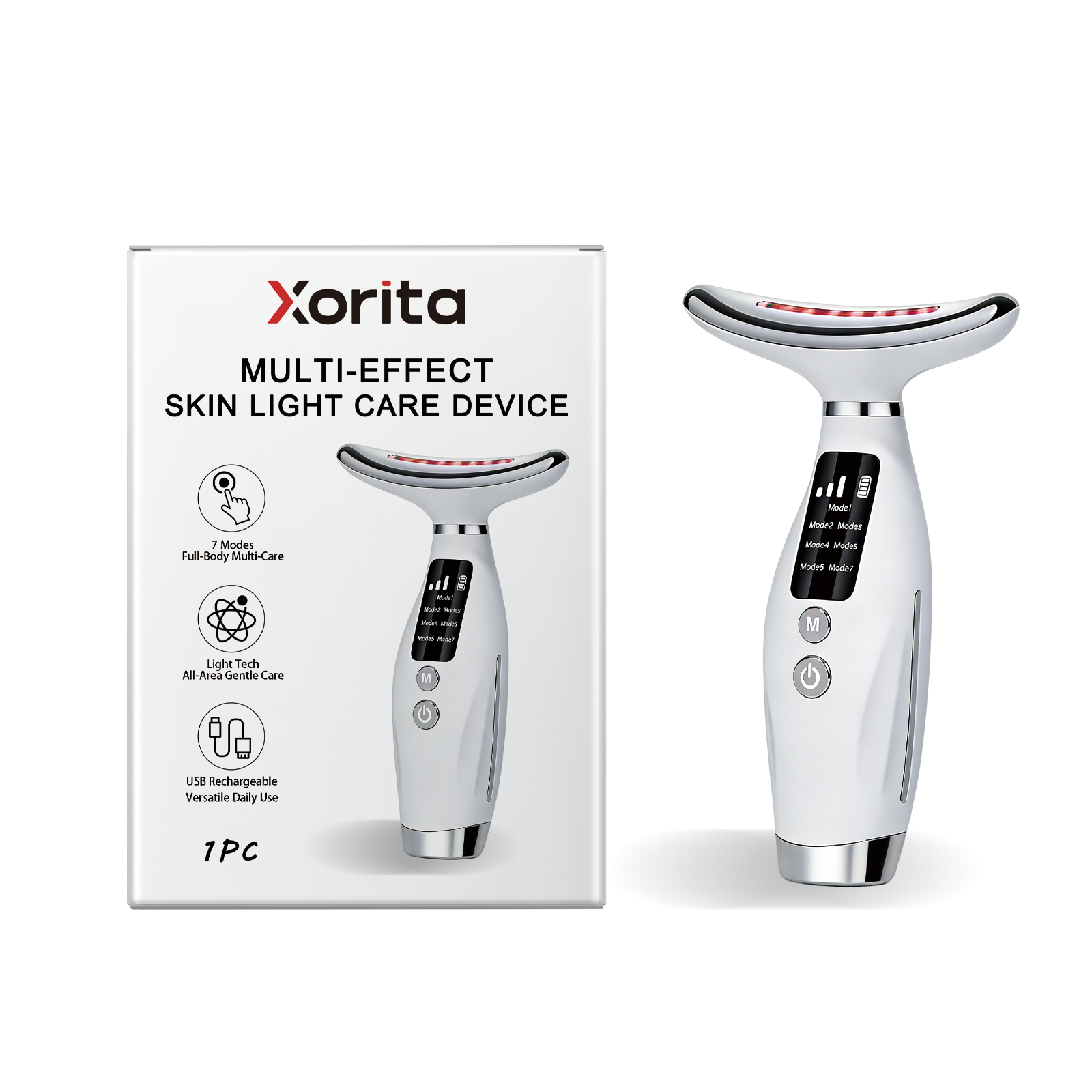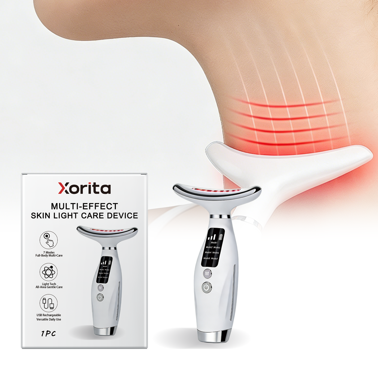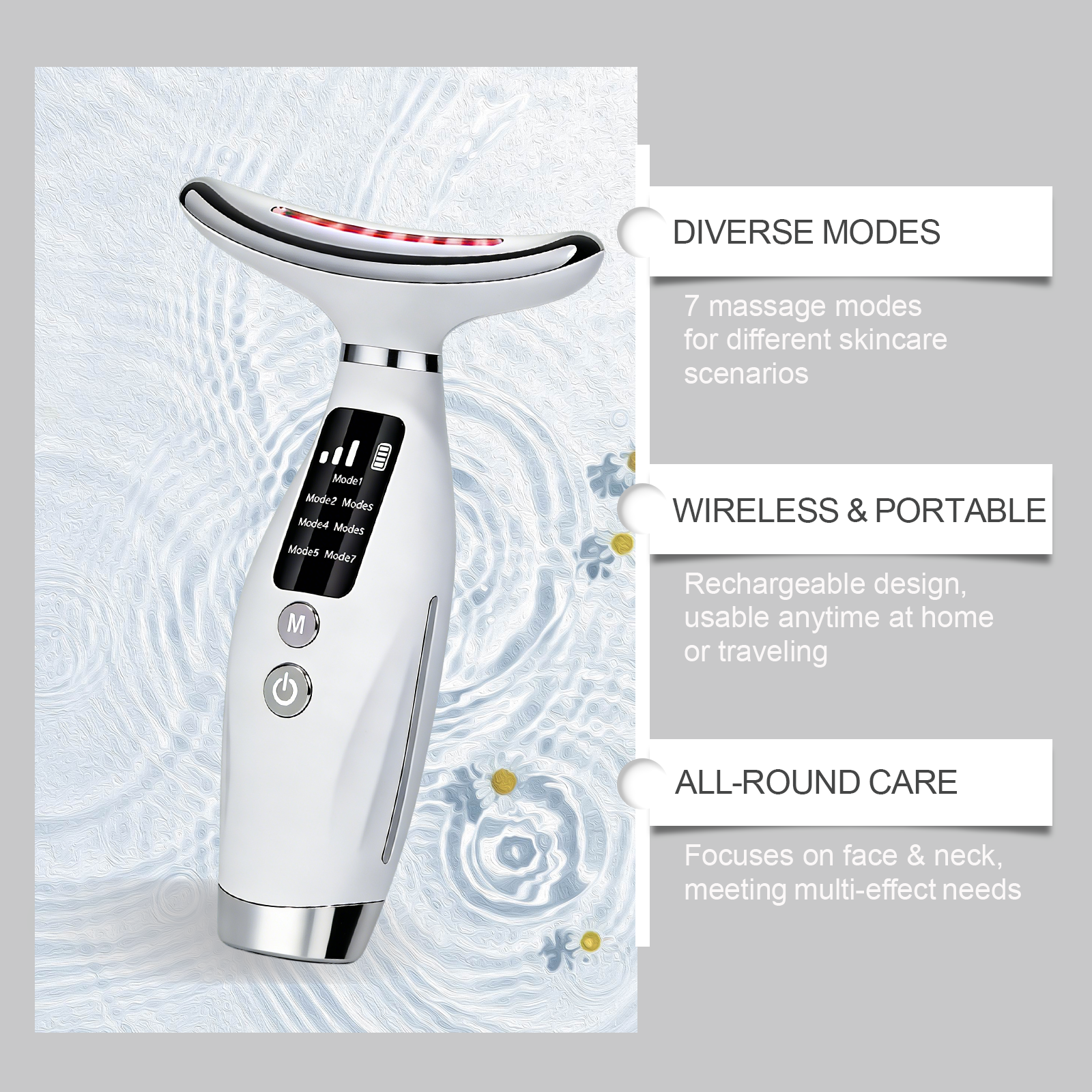 我们的多功能光疗仪,由ABS+聚合物锂电池精心制作而成。专为专注于面部和颈部,满足多重效果需求设计。使用方法极为便捷:1.按电源键开机,选择合适模式;2.贴合需护理的皮肤区域,开启光疗;3.单次使用 10-15 分钟;4.用后关机,清洁仪器。详情请看说明书。并且它有7种按摩模式,适用于不同的护肤场景。