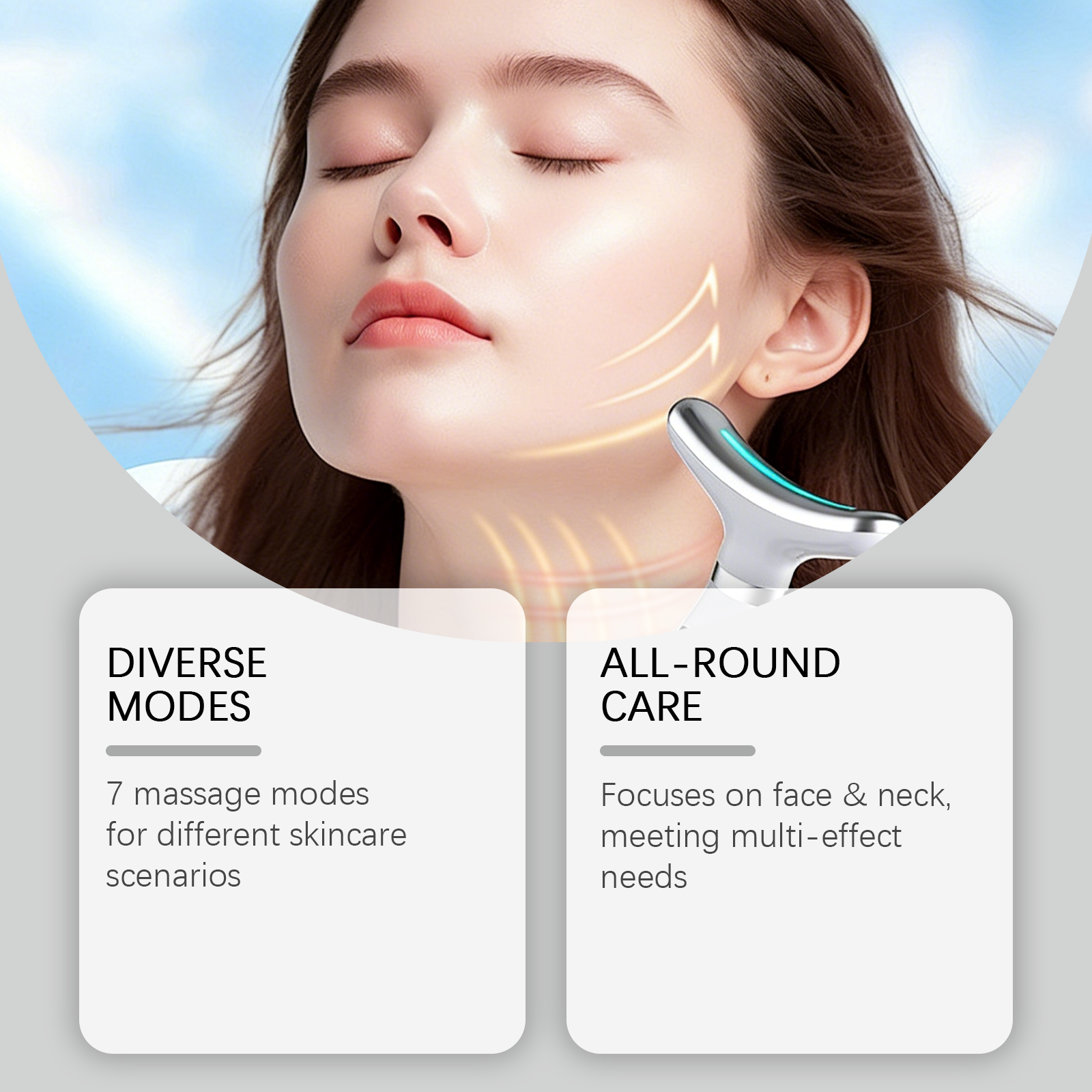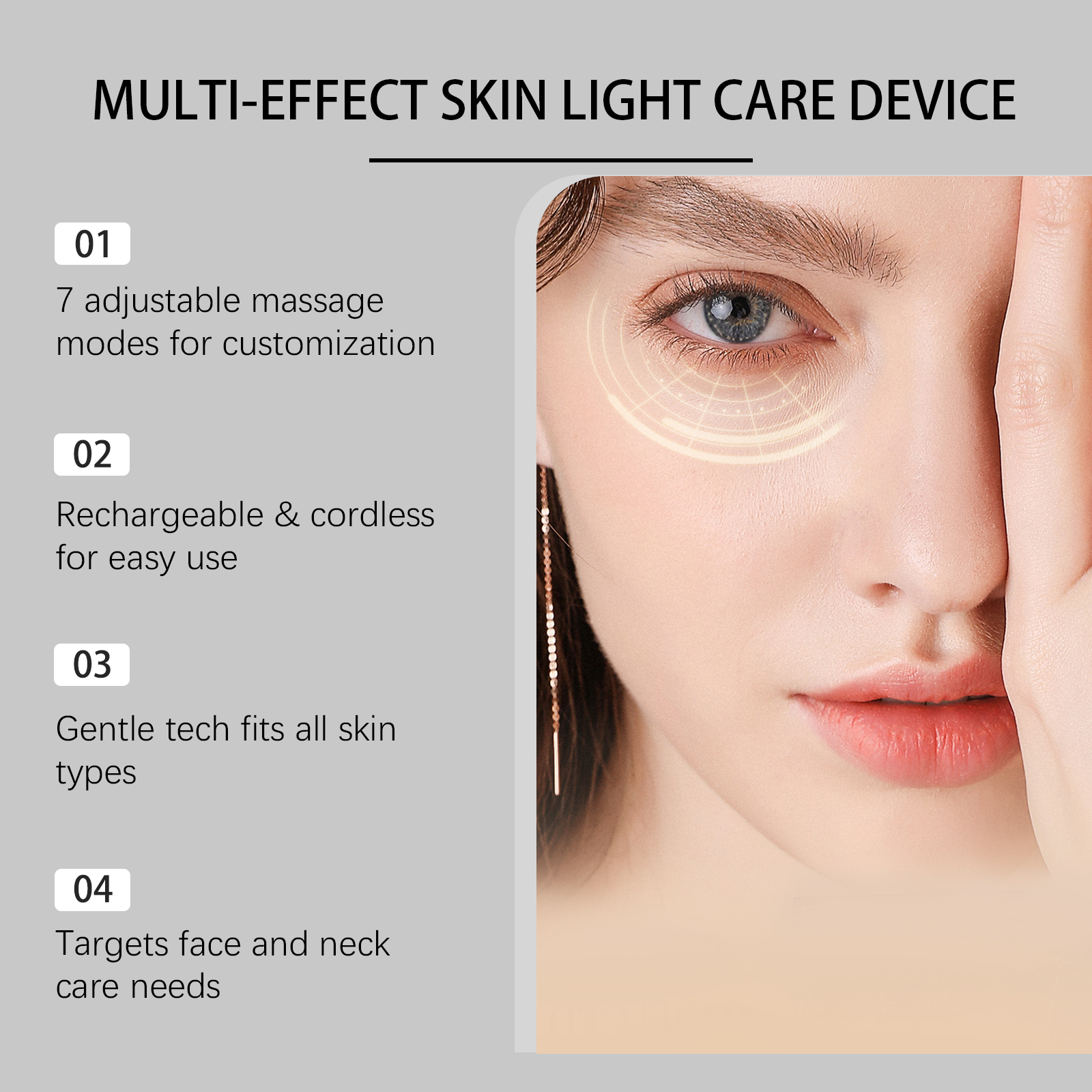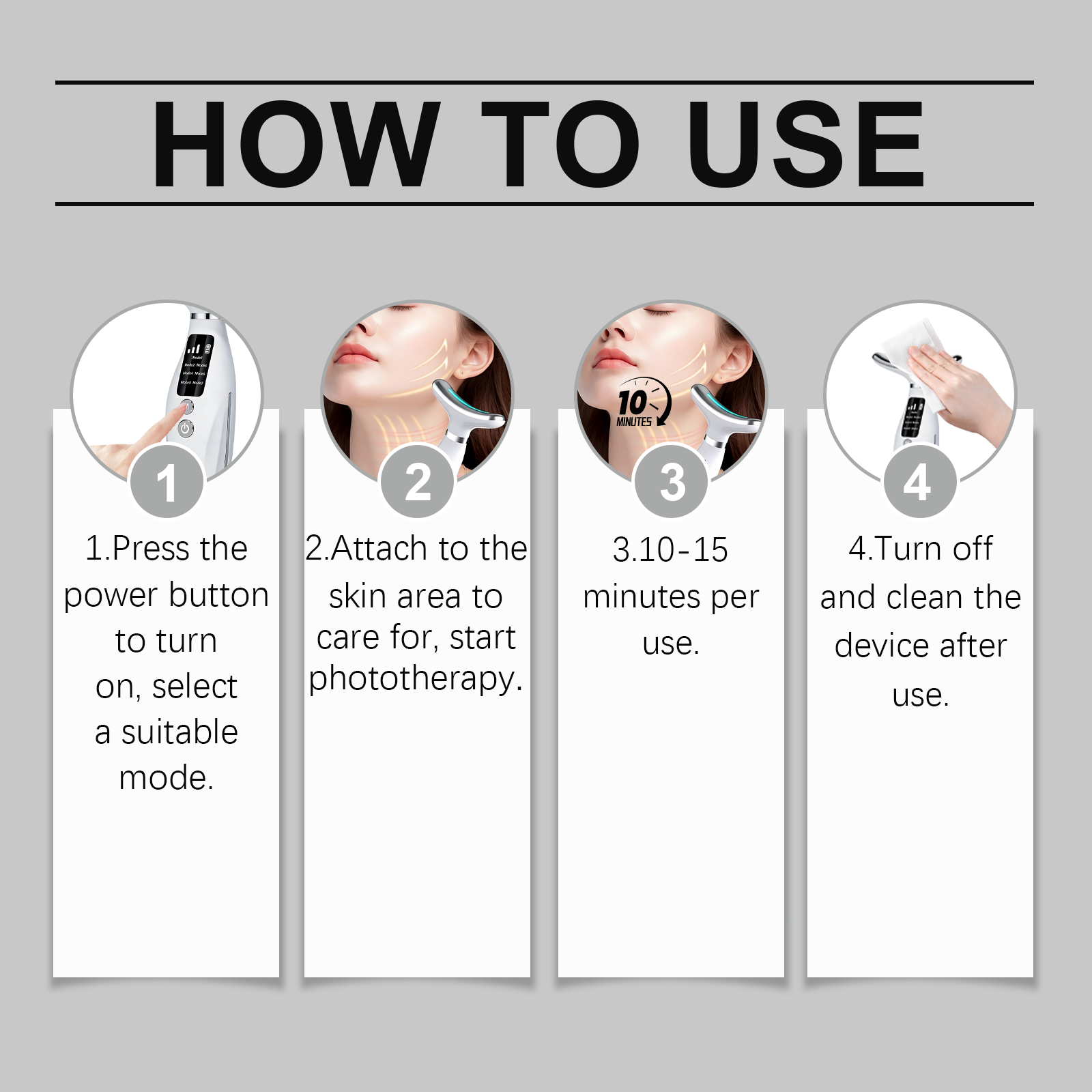 我们的多功能光疗仪,由ABS+聚合物锂电池精心制作而成。专为专注于面部和颈部,满足多重效果需求设计。使用方法极为便捷:1.按电源键开机,选择合适模式;2.贴合需护理的皮肤区域,开启光疗;3.单次使用 10-15 分钟;4.用后关机,清洁仪器。详情请看说明书。并且它有7种按摩模式,适用于不同的护肤场景。