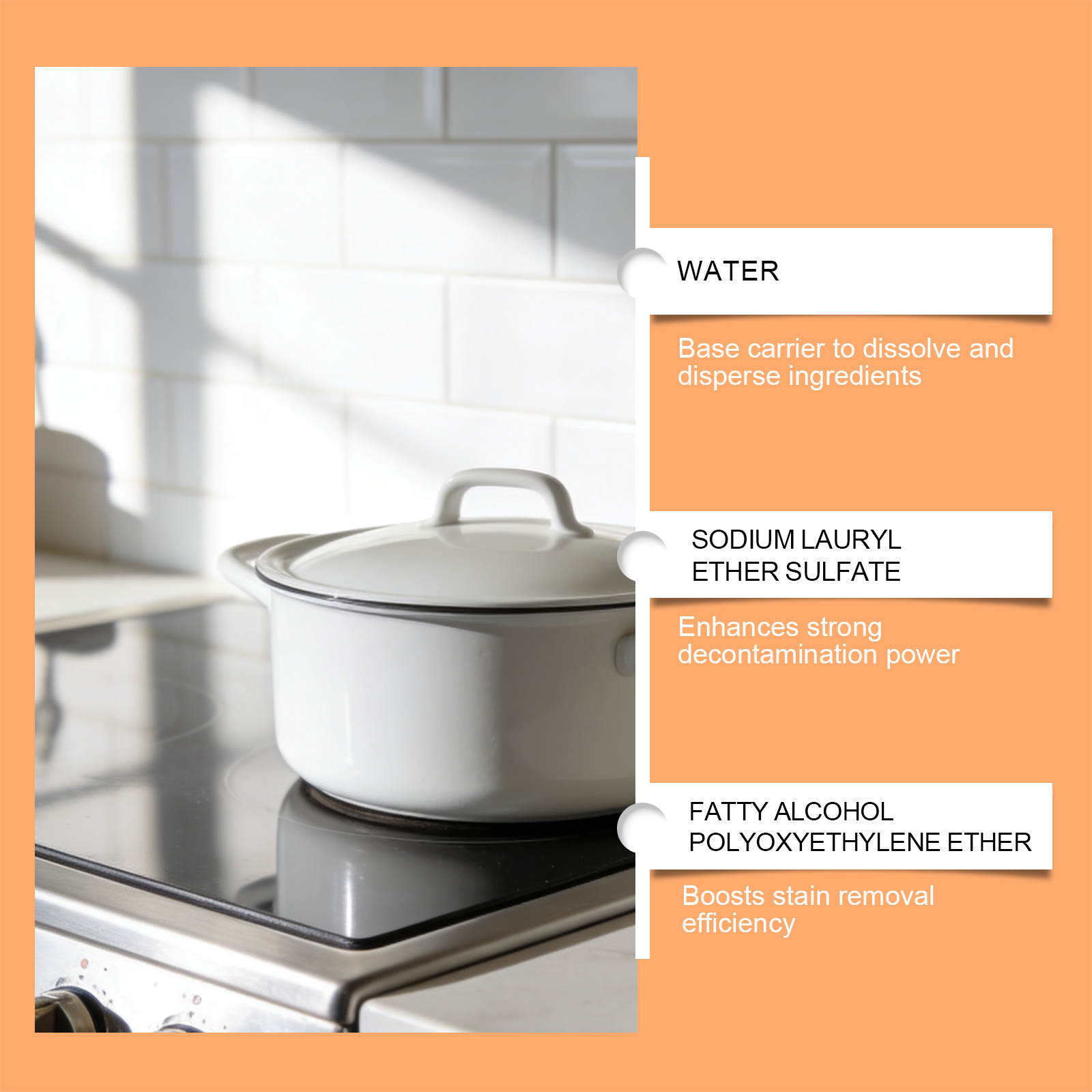 我们的厨房电器清洁剂,由月桂醇聚醚硫酸酯钠、脂肪醇聚氧乙烯醚精心调配而成。专为针对厨房电器污渍,兼容常见厨房设备设计。使用方法极为便捷:首先,拔掉电器的电源。然后,轻轻将清洁剂喷酒在脏污表面。让清洁剂静置片刻,以软化污垢,特别是顽固污渍。让清洁剂静置片刻,以软化污垢,特别是顽固污渍。并且它可以有助于保持舒适的消化状态。