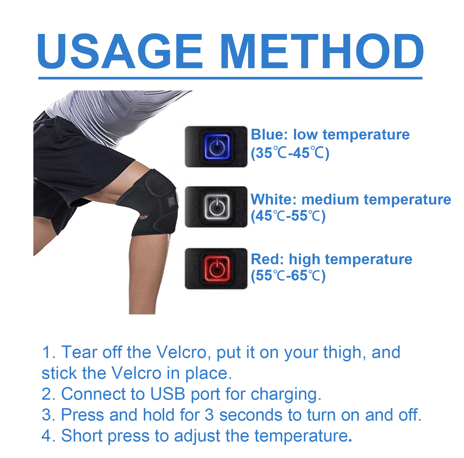 我们的3合1骨盆支撑压缩带含有锦纶86%、氨纶14%。它可以改善血液循环,并在骨盆倾斜时提供缓解,减少水肿,并提供有针对性的压力,给您急需的救济。它的使用方法很简单:撕下尼龙搭扣,把它放在大腿上,然后把尼龙搭扣贴在适当的位置,连接USB端口充电即可,按住3秒钟即可打开和关闭,短按以调整温度。可以解决不适的根本原因,促进自然愈合,促进血液循环。