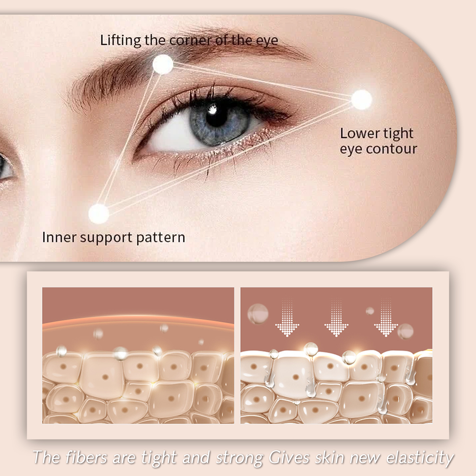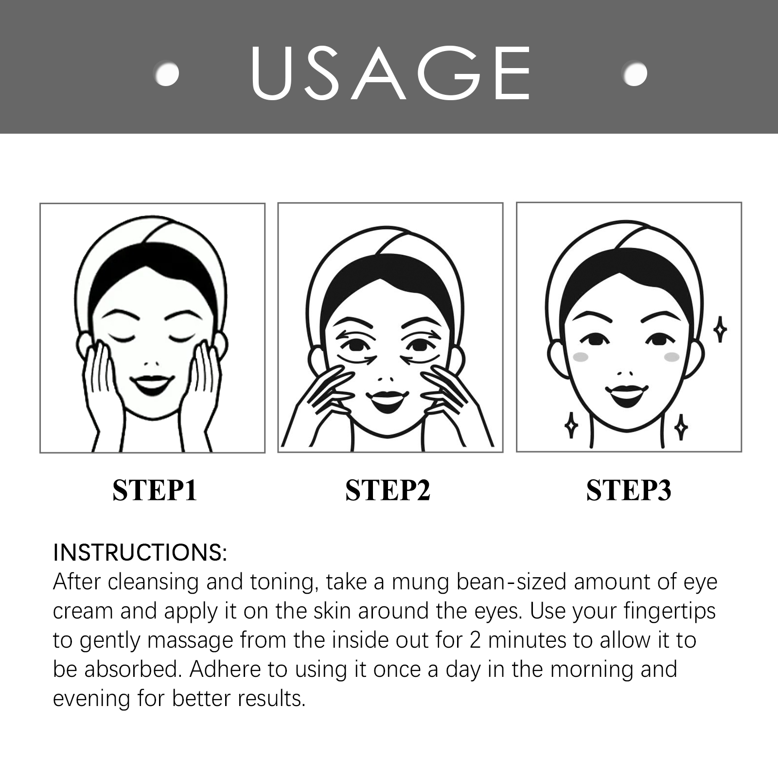 我们的眼霜含有烟酰胺、曲酸、透明质酸。可以舒缓眼周肌肤,深层渗透提亮眼周肌肤,改善眼周肌肤弹性,提亮眼角。它的使用方法很简单:洁面爽肤后,取绿豆大小的眼霜涂抹在眼周肌肤上,从内到外轻轻按摩2分钟,使其完全吸收。减少眼部皱纹,收紧眼周皮肤,让您更加年轻、容光焕发。