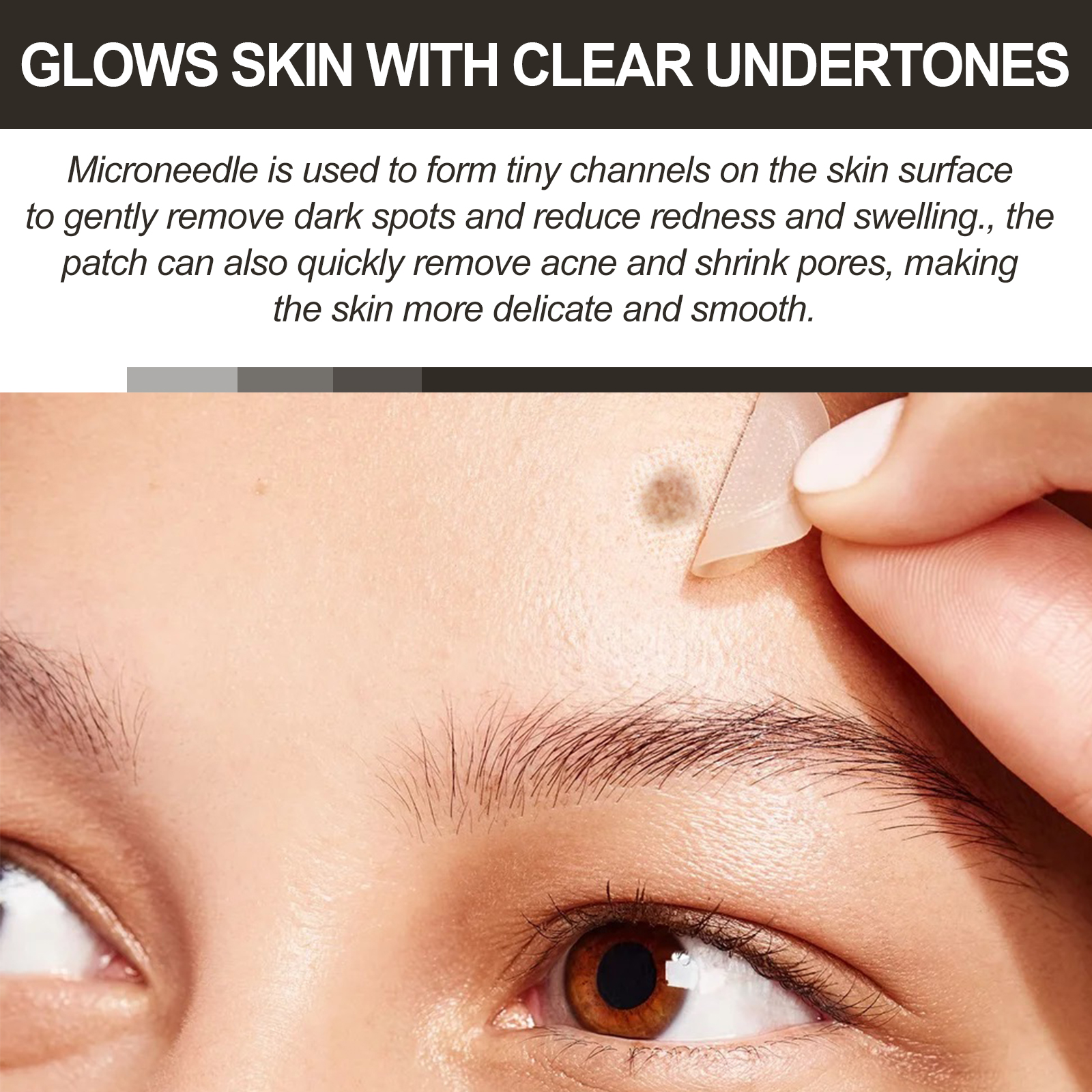 我们的斑点贴片含有抗坏血酸(维生素C)、水杨酸。它可以利用微针在皮肤表面形成微小通道,温和祛除黑斑、减轻红肿,改善肤色暗沉,使皮肤均匀白皙。它的使用方法很简单:洁面后,将脸部擦干,撕下贴膜、露出微针,将贴片直接贴在黑斑、瑕疵或粉刺上约8-12小时,取下贴片后再进行常规的皮肤护理。快速祛痘、收缩毛孔,减少斑点和瑕疵,从而使皮肤更加光滑细腻。