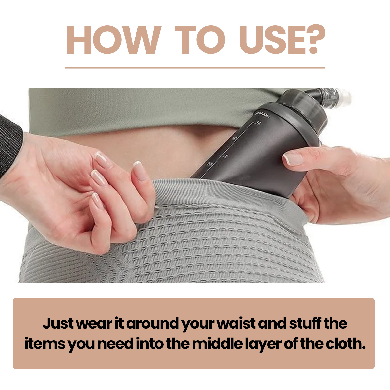 我们的弹性运动腰包含有92%聚酯,8%氨纶。它可以贴合腰部曲线,提供舒适的佩戴体验,不易滑动或晃动,有效减少运动时的不适感。它的使用方法很简单:只需要把它围在腰上,把你需要的东西塞到布的中间层即可。可存放手机、钱包、钥匙、水瓶等必备运动用品。方便快捷。可以藏在其他衣服下面,让别人看不见,防止你的财物丢失。
