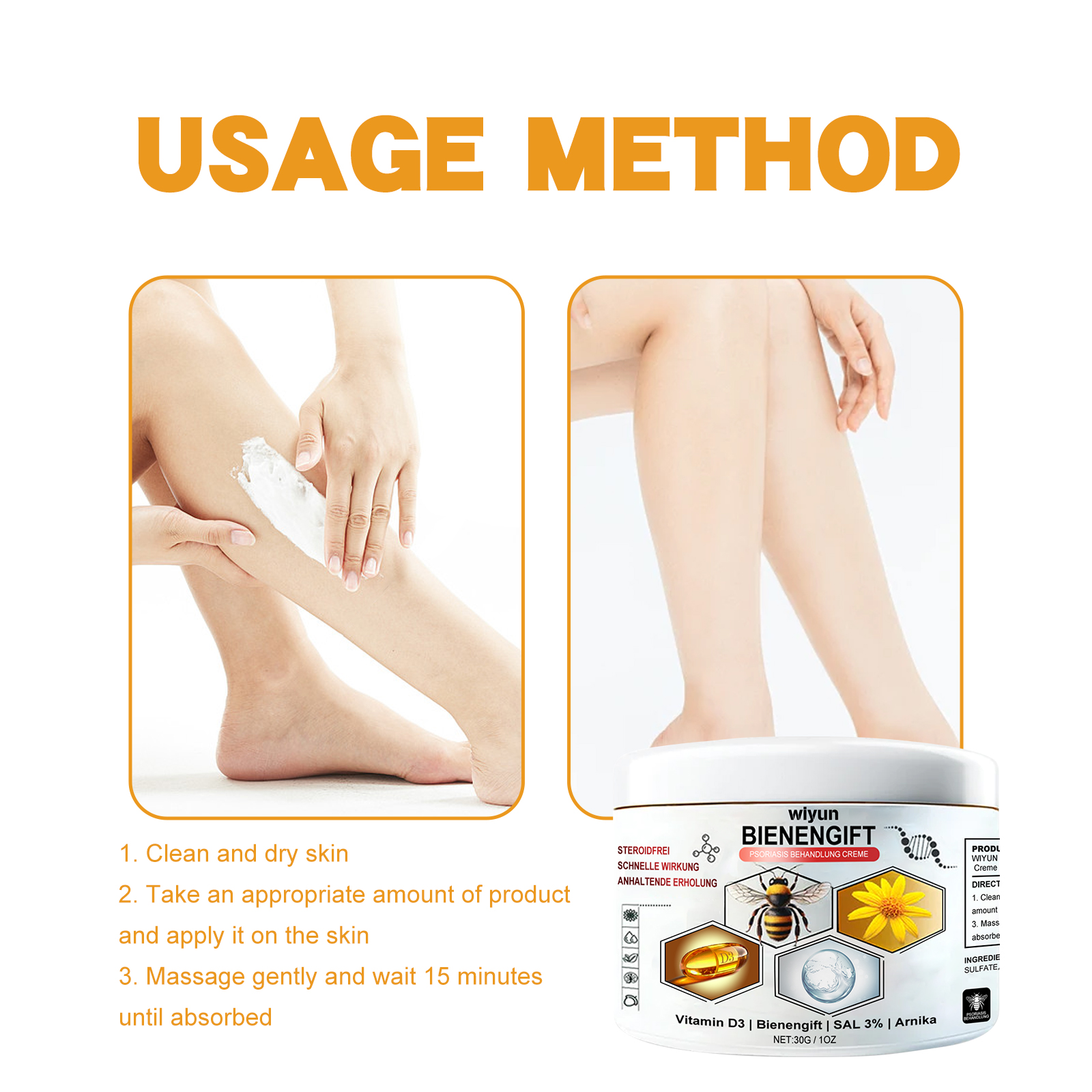 我们的蜂毒皮肤护理霜含有透明质酸、维生素D3。它可以使牛皮癣永久消失,减少发痒发红,促进新皮肤细胞;舒缓保湿,抗瘙痒消炎,抑制复发,拥有健康的皮肤。它的使用方法很简单:清洁并擦干肌肤,取适量产品,涂于皮肤上,轻轻按摩,等待15分钟至吸收即可。可以提供舒缓和恢复的效果,以减轻不适。