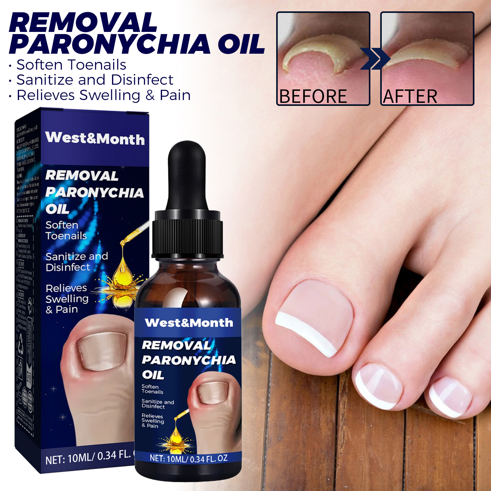 我们的指甲护理油含有矿油、氢化蓖麻油。它可以有效维持脚趾甲健康,缓解疼痛,促进指甲健康再生,顺滑指甲,有效缓解脚趾甲向内生长,对所有年龄段的人都是安全的。它的使用方法很简单:只需每天用涂抹器在受影响的脚趾上刷两次趾甲滴液,直到指甲可以从凹槽中取出并轻松修剪。并且可以修护指甲。