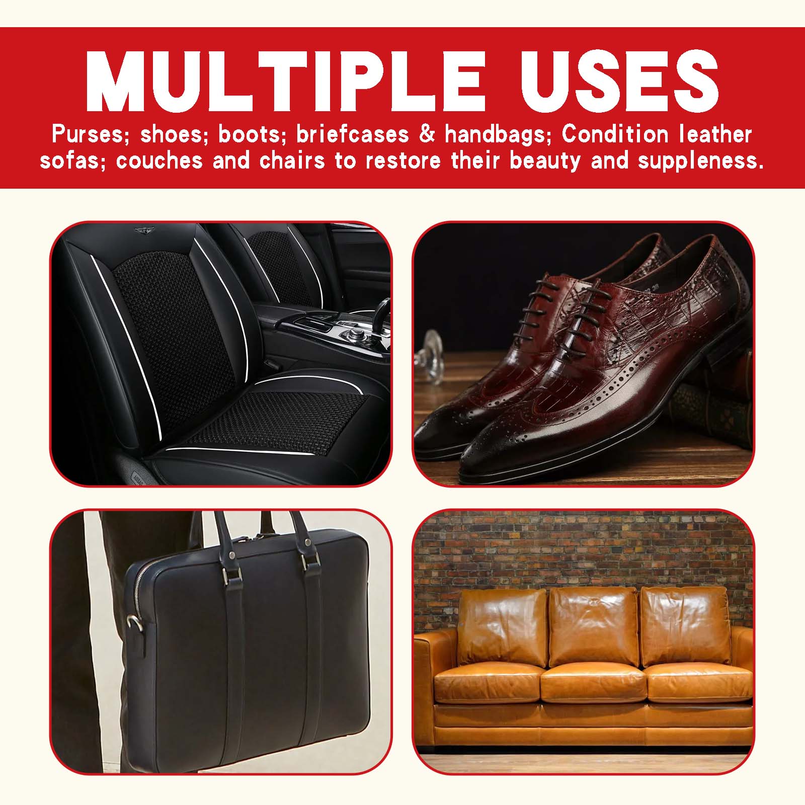 我们的鞋子清洁膏套装含有椰油酰胺丙基甜菜碱、EDTA二钠、碳酸氢钠。它可以去除污渍无残留,强力溶解污渍,用海绵擦拭,让鞋子焕然一新。它的使用方法很简单:将本品涂在鞋上需要清洁的地方,并等待1分钟,让污渍溶解,用海绵擦去鞋面上剩余的污渍,最后去除残留物即可。可以清洁的同时可以保护鞋面,清洁后鞋面柔软、光滑、不坚硬。