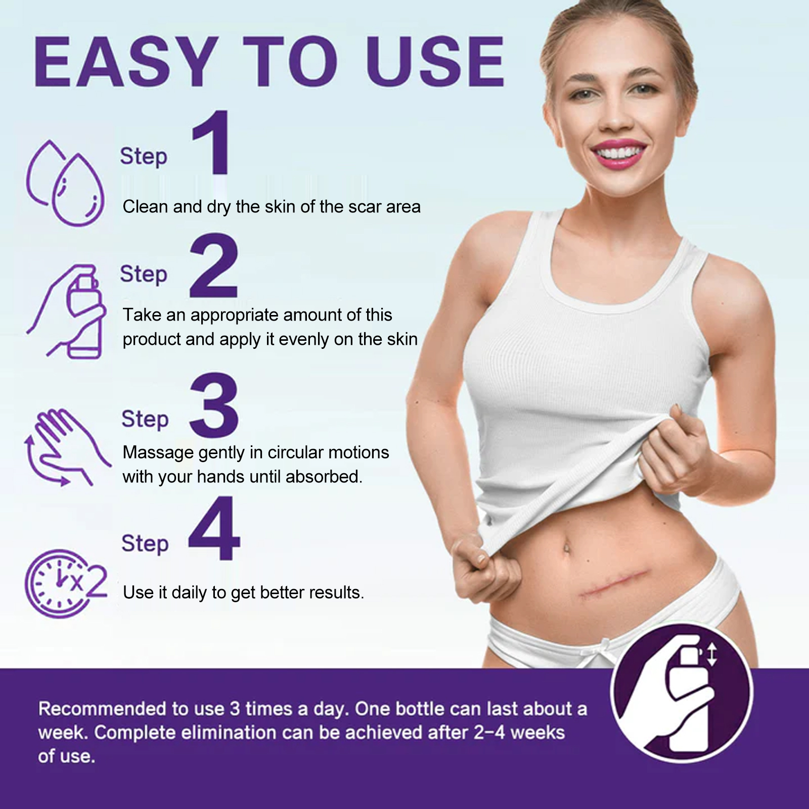 我们的疤痕修护霜含有薄荷提取物、尿囊素、水解胶原蛋白。它可以滋润肌肤、软化疤痕组织,减少黑色素沉淀、促进皮肤代谢,改善坏死组织的组织代谢。它的使用方法很简单:清洗并擦干疤痕处的皮肤,去适量修护霜用手沿圆周方向轻轻按摩,直至完全吸收,坚持每天使用,效果更好。温和无味、无形修护,减少红肿,软化和抚平疤痕。