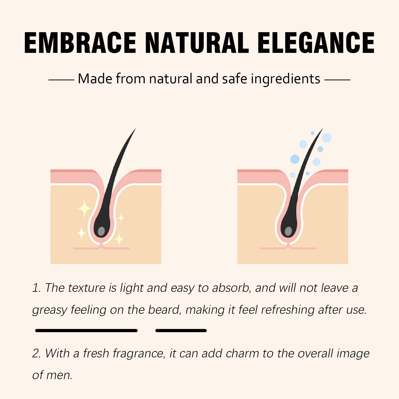 我们的胡须护理油,由荷荷巴籽油、葵花籽油、杏仁油精心调配而成。专为滋润和软化干燥的胡须,保持浓密、健康、易卷曲的胡须设计。使用方法极为便捷:洗净并擦干你的胡子。将少量产品涂抹在手上。将精油涂抹在胡须上,轻轻按摩。有助于减少胡须分裂和断裂,使其更容易梳理和保持整洁。
