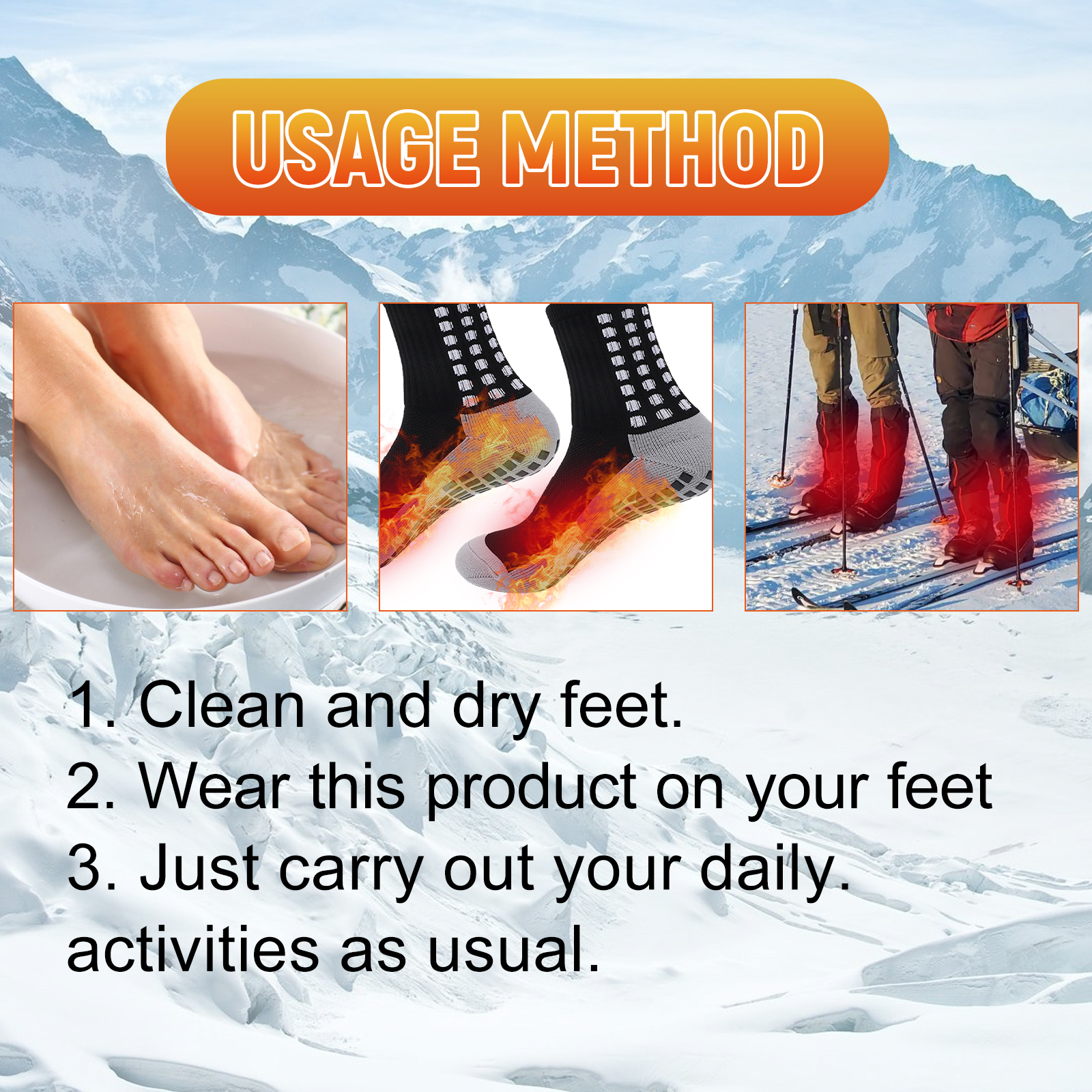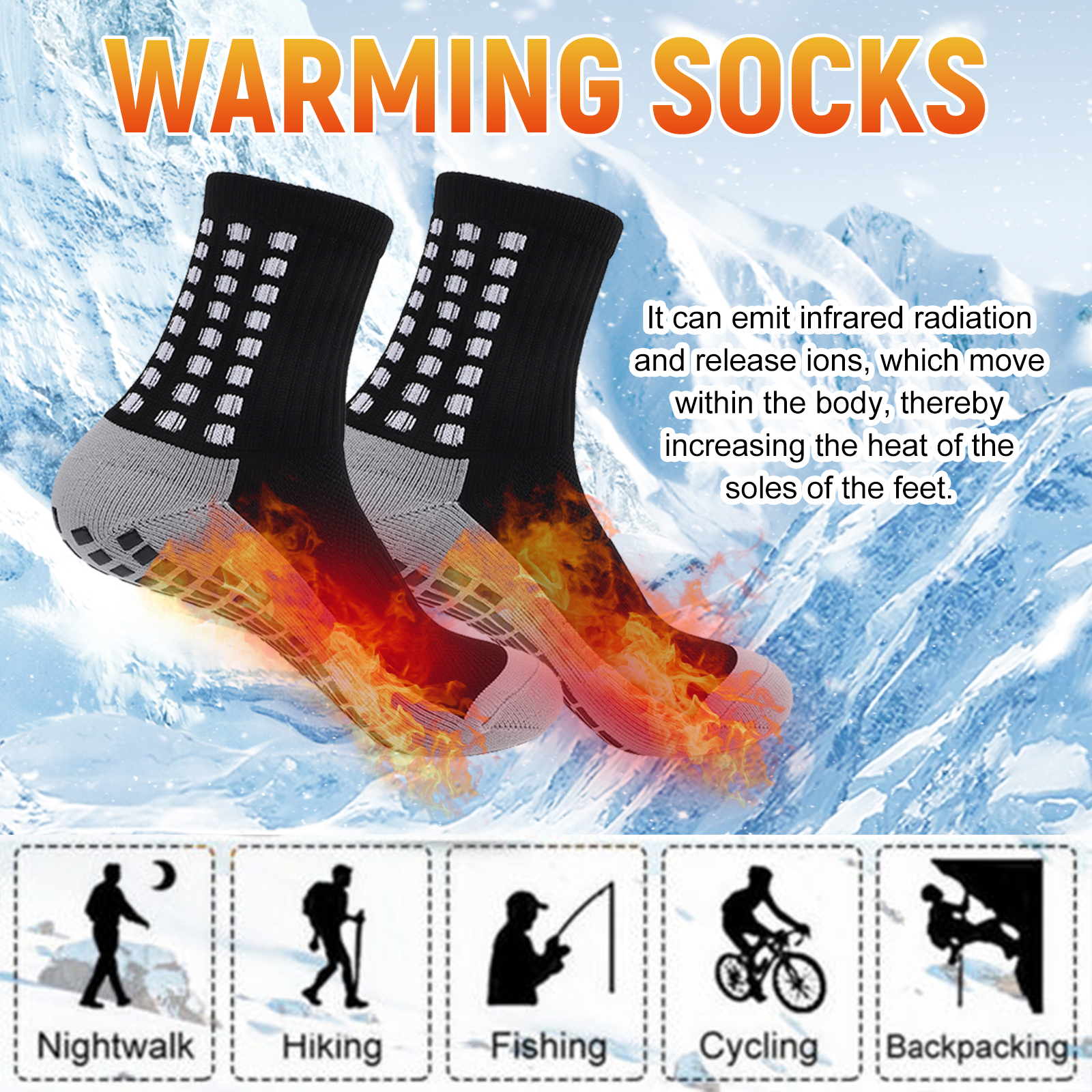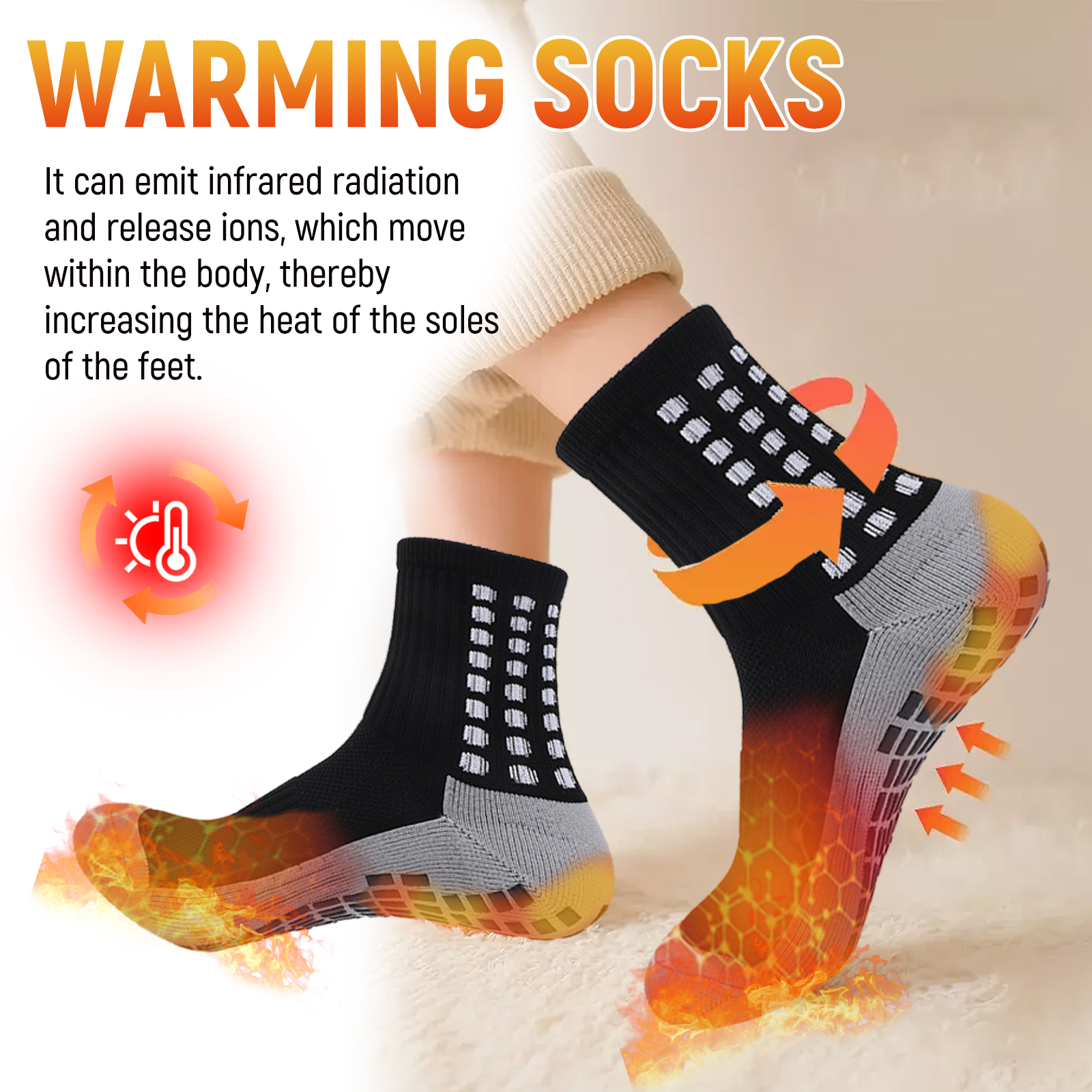 我们的离子按摩袜含有聚酷纤维、氨纶。它可以发出红外线辐射并释放离子,这些离子在体内运动,从而增加脚底的热量。它的使用方法很简单:清洁和干燥脚。将本产品涂在脚上。就像往常一样进行你的日常活动。材质柔软,保暖舒适。