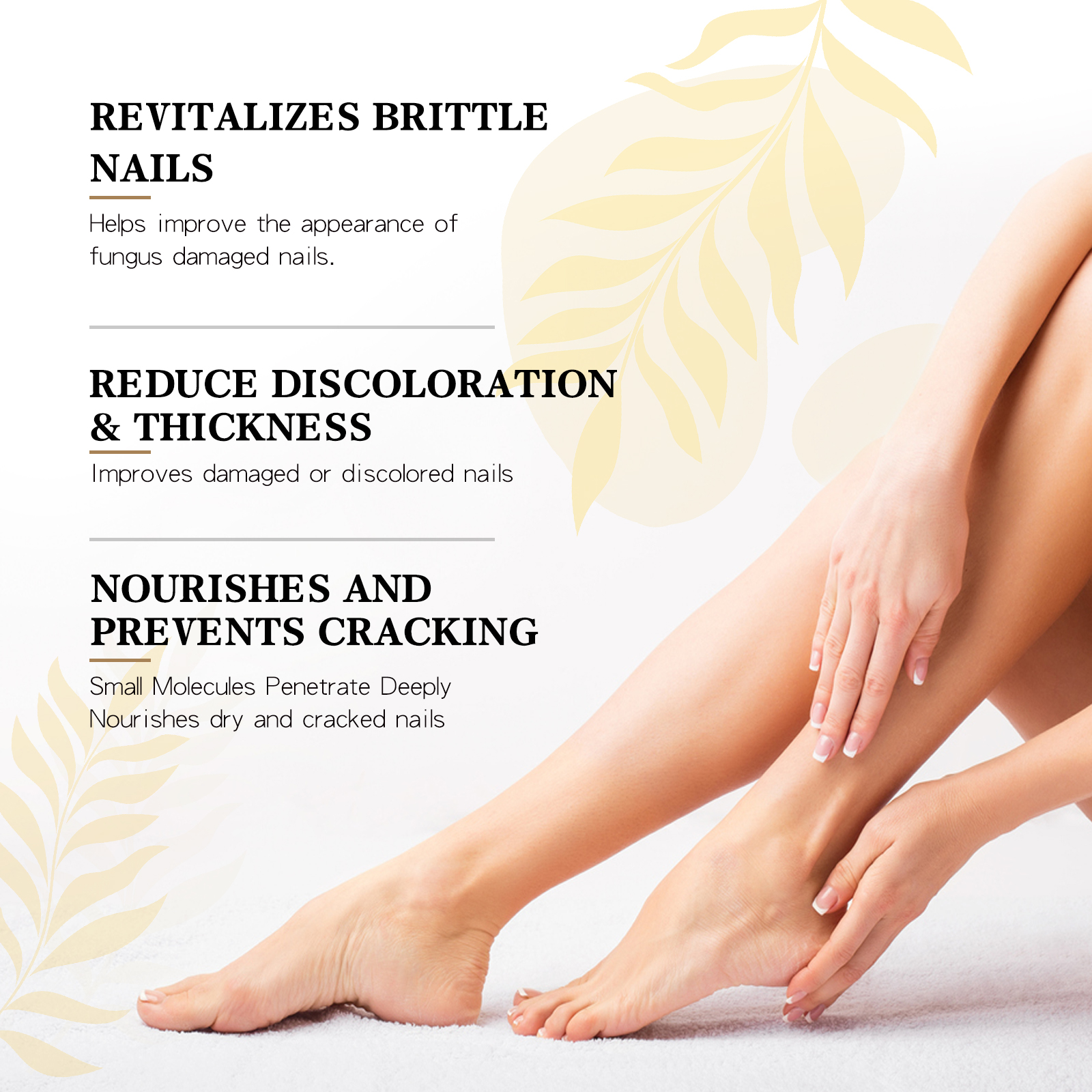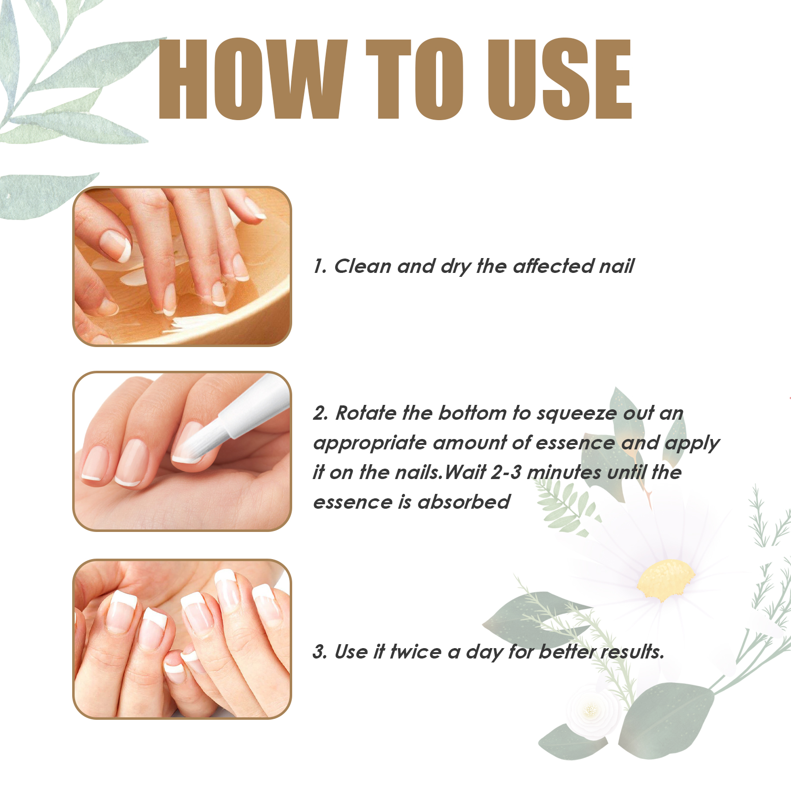 我们的指甲护理液含有霍霍巴油、维生素E、橄榄油。它可以修复受损脆弱的指甲,帮助改善被真菌损坏的指甲的外观,减少指甲破损伤害的影响。它的使用方法很简单:首先清洁并干燥受影响的指甲,之后旋转底部挤出适量的精华液涂抹在指甲上,等待2-3分钟直至精华液被吸收。每天使用两次可达最佳效果,改善指甲问题,抑制真菌生长,帮助指甲快速生长并恢复,重塑美丽指甲。