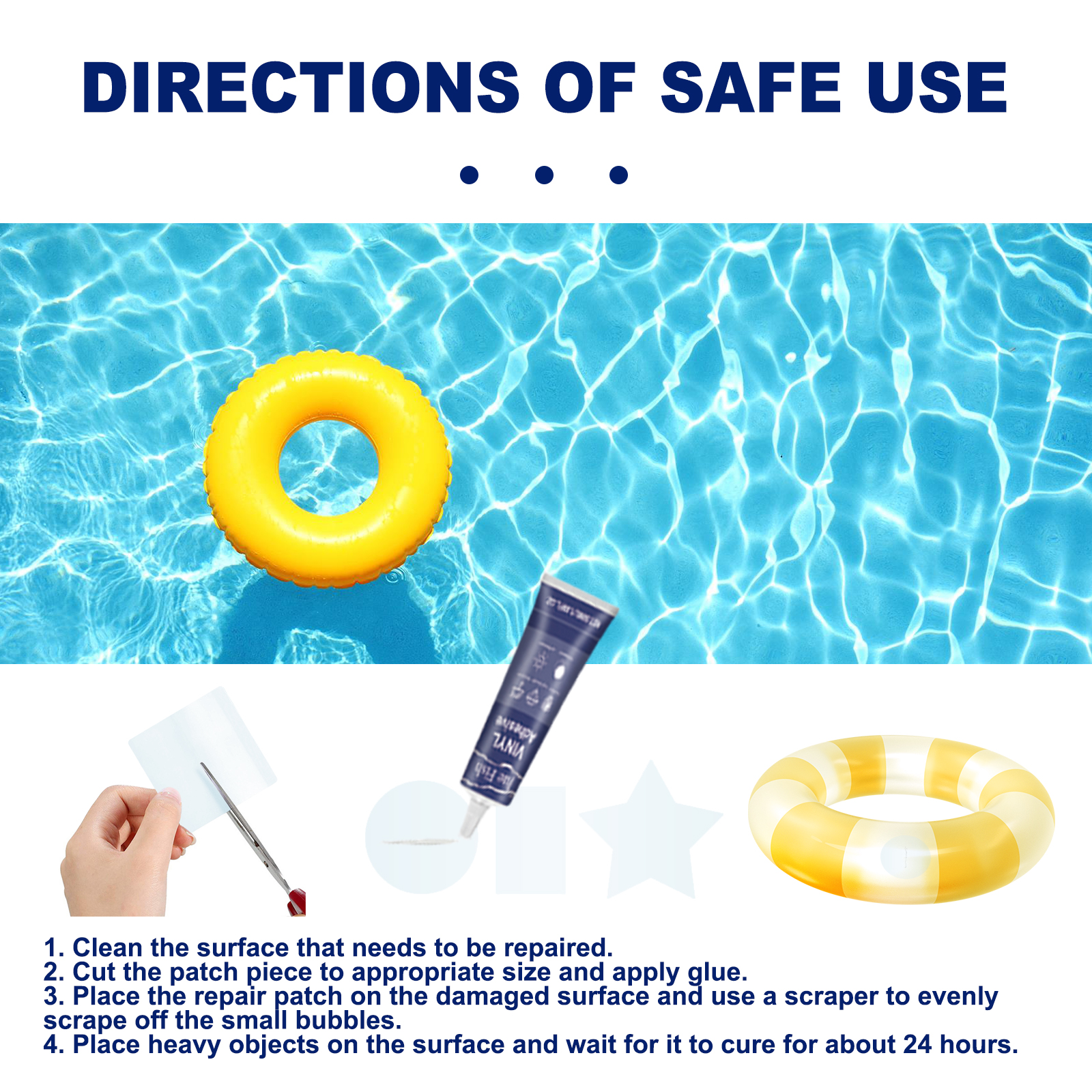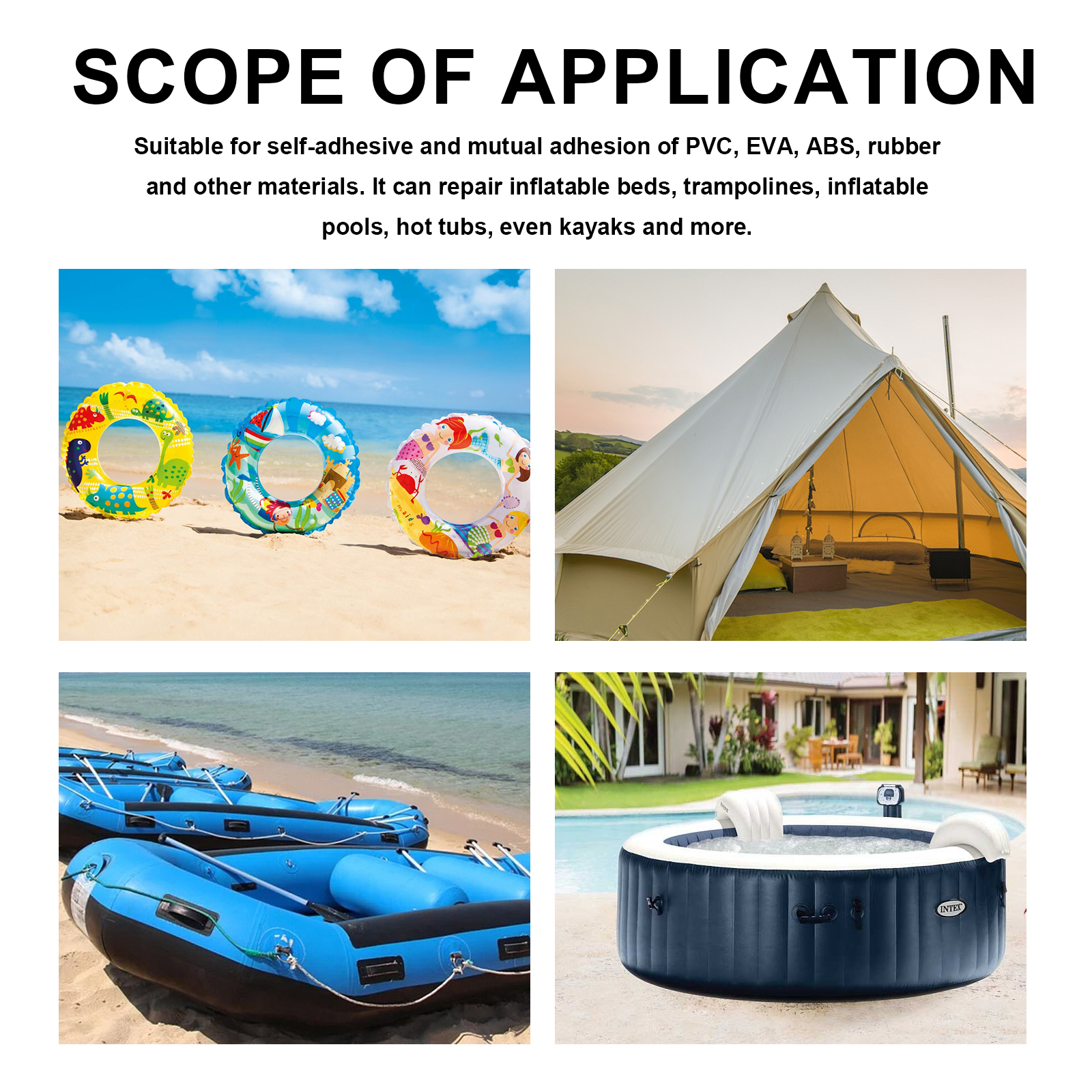 我们的充气补丁修复套件含有乙烯/醋酸乙烯酯共聚物、环氧丙烯酸树脂、聚乙烯树脂。它可以在乙烯和修补补丁之间形成超强粘合力,使其气密、柔韧且防水,使用此产品能够快速修复充气产品和其他PVC产品上的刺穿、撕裂或孔洞。它的使用方法很简单:将需要修复的表面清理干净,把修补片剪成合适的尺寸然后涂胶,将修补贴片贴在破损表面后用刮板均匀地刮去小气泡,在表面放上重物约24小时等待其固化即可。材质透明,可以维持产品的美观,不让补丁破坏充气玩具的外观。适用于PVC、EVA、ABS、橡胶等材料的自粘和互粘,可以修复充气床、蹦床、充气泳池、热水浴缸甚至皮划艇等。