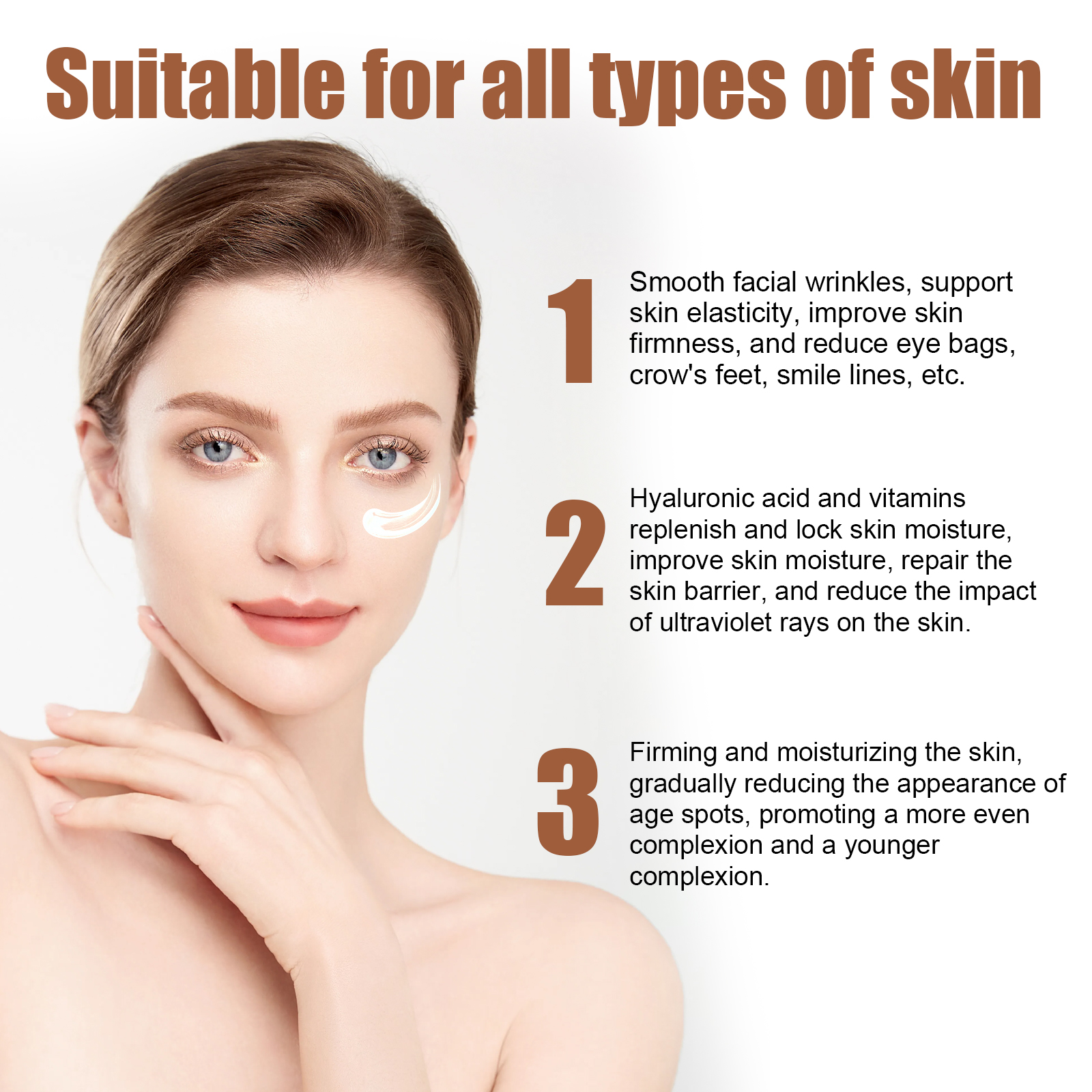 我们的防衰老面霜含有烟酰胺、透明质酸、维生素C。它可以深层滋润丰盈肌肤,减少细纹的出现,淡化色斑和瑕疵,使皮肤保持健康有光泽。它的使用方法很简单:洁面后将脸部擦干,取适量面霜均匀涂抹于面部皮肤上,轻轻打圈按摩至产品吸收,坚持每天使用可以获得更好的效果。减少水分流失,有效滋养、嫩滑肌肤。