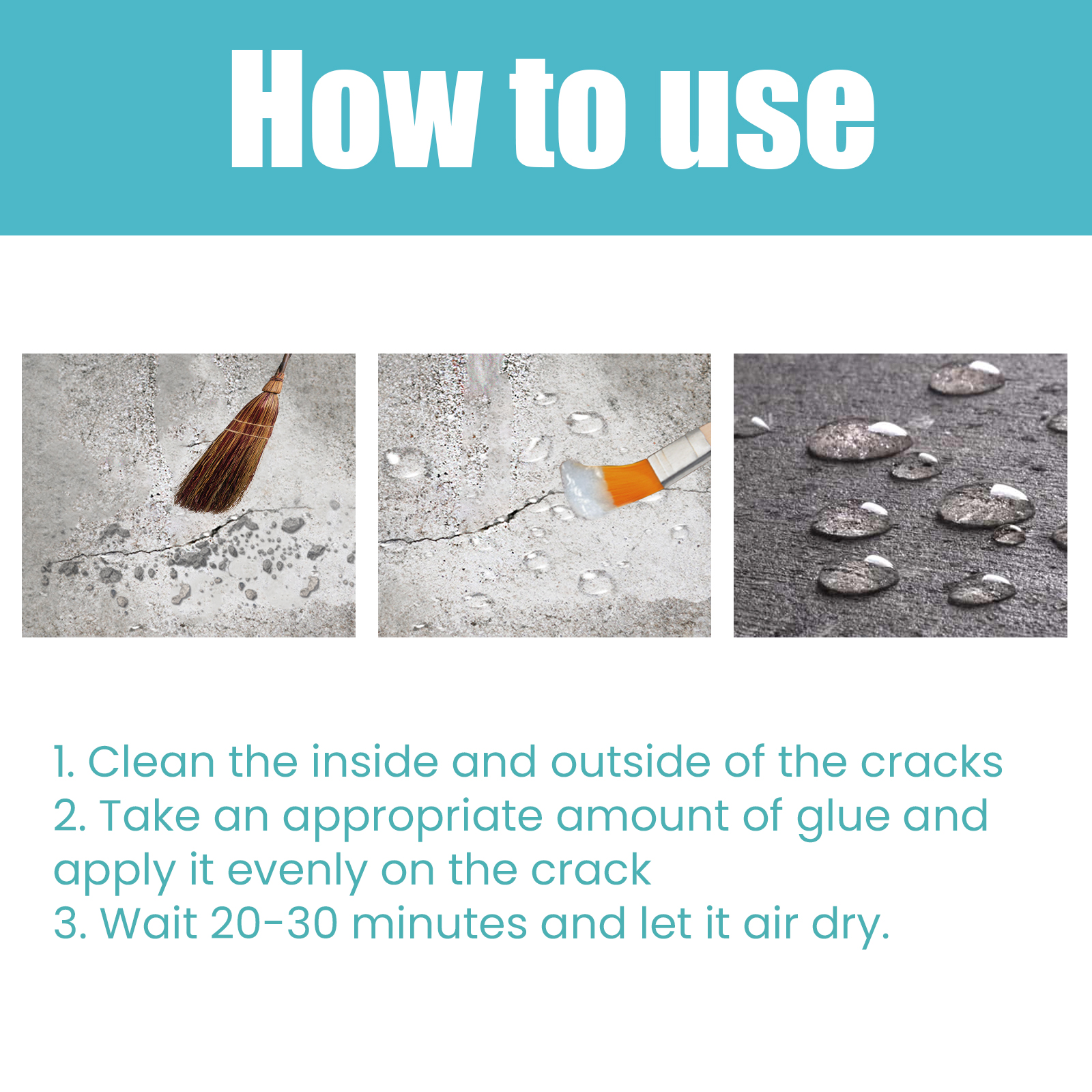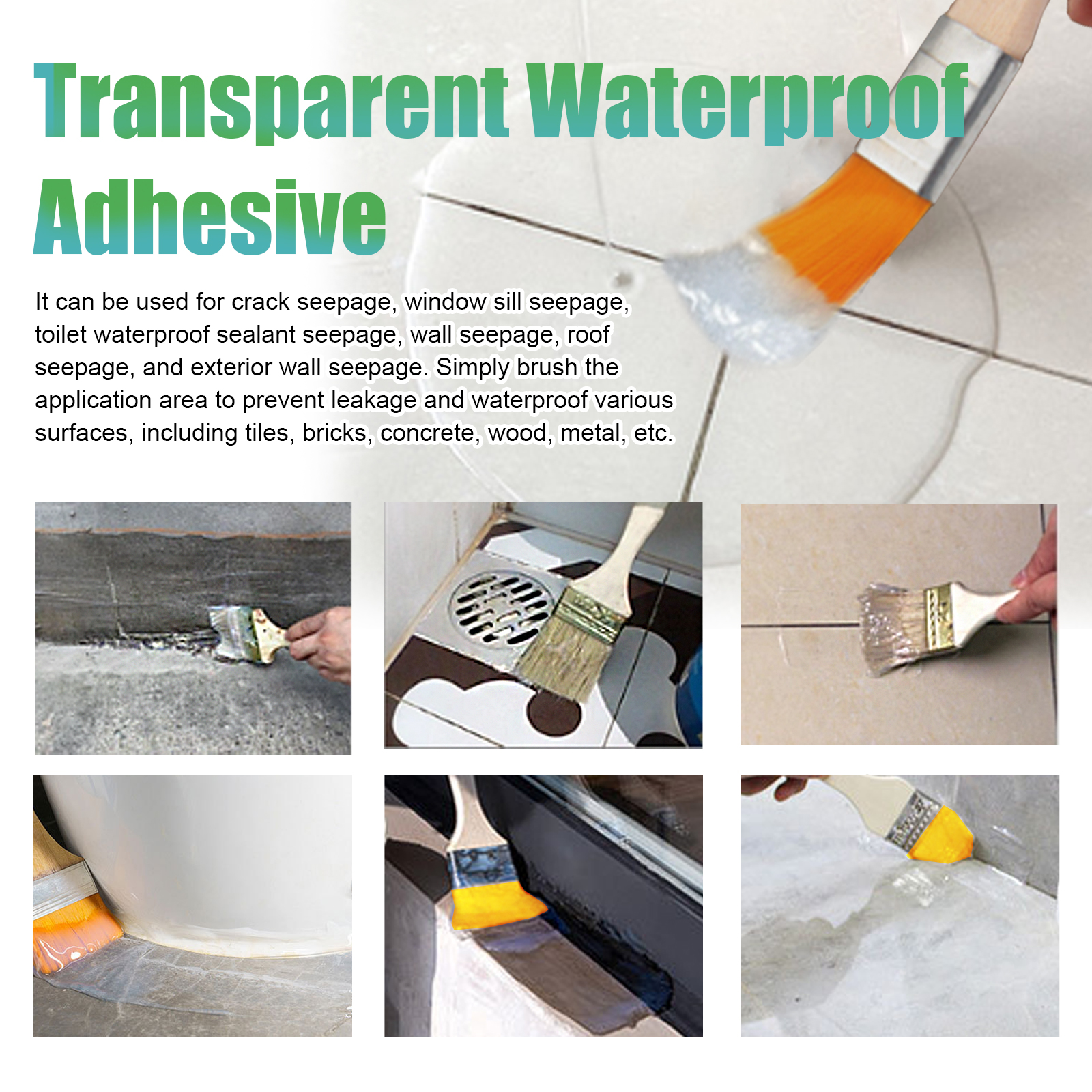 我们的透明防水胶含有纯丙乳液、硅丙乳液、消泡剂。它可以用于裂缝渗水、窗台渗水、卫生间防水密封胶渗水、墙体渗水、屋面渗水、外墙渗水,只需刷涂应用区域,防止渗漏和防水各种表面,包括瓷砖,砖,混凝土,木材,金属等。它的使用方法很简单:清洁裂缝的内外,取适量胶水均匀涂抹在裂缝处,等待20-30分钟,让它自然风干。并且可以防水。