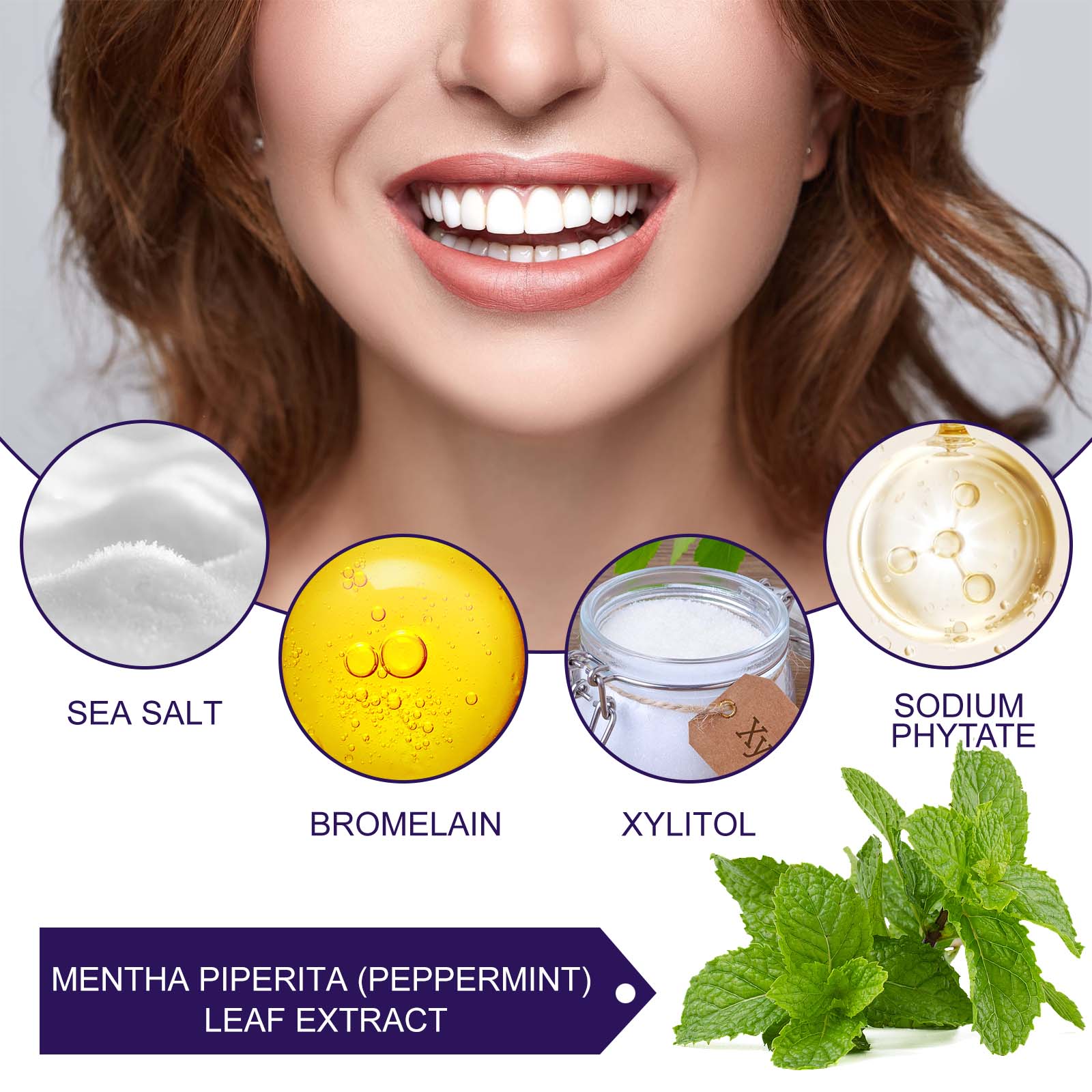 我们的紫色亮白牙膏含有植酸钠、薄荷叶提取物、海盐。它可以保护您的牙龈,有助于口腔健康,能够有效去除牙齿表面的色素沉淀,美白牙齿,让您拥有更自信的笑容。它的使用方法很简单:打开盖子,用牙刷取适量牙膏,用正确的方法刷牙2-3分钟,再用清水漱口即可。可以清新您的口腔气味,持久留香,提升您的舒适度。