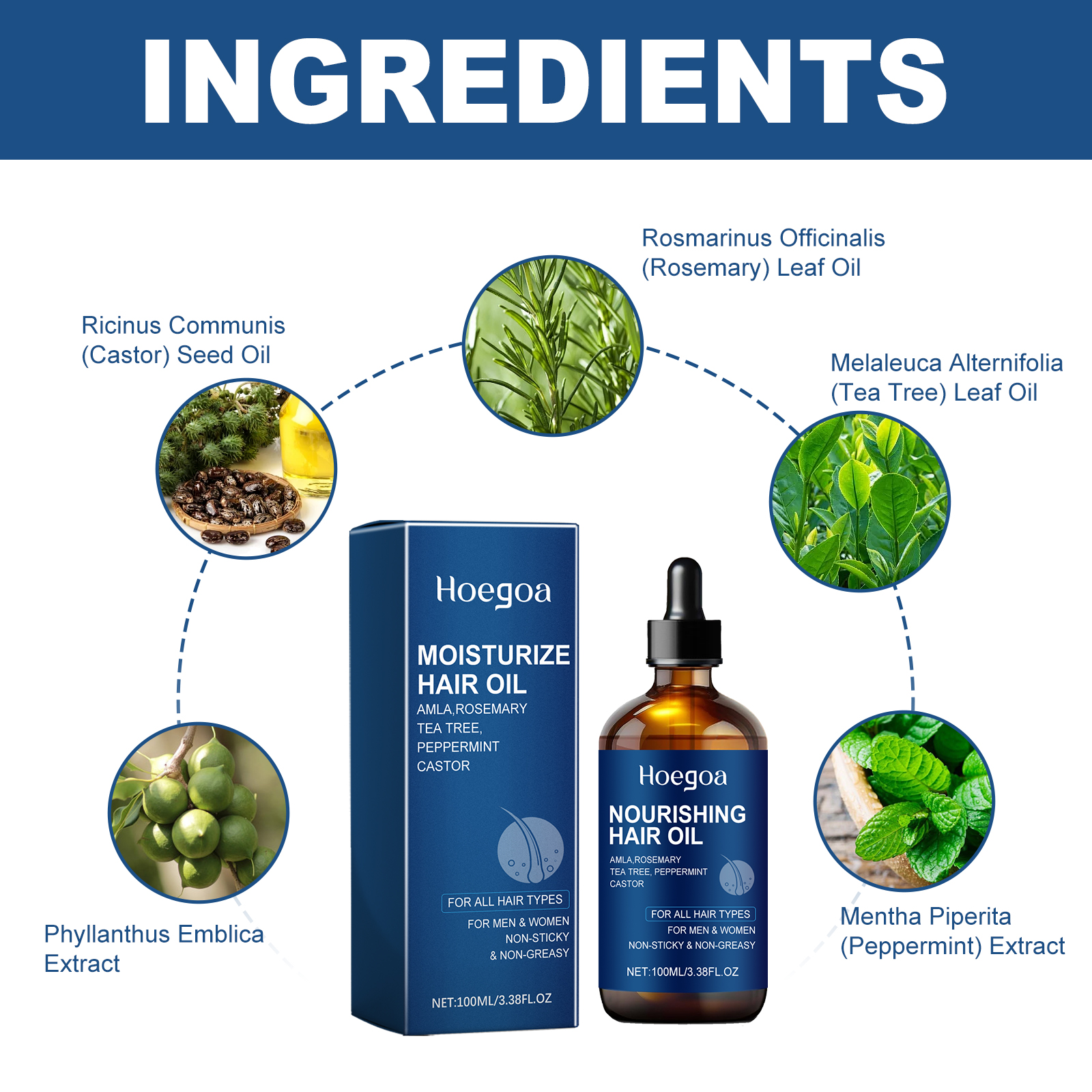 我们的滋养护发精油含有余甘子提取物、蓖麻油、迷迭香油。它可以1.滋养头发,防止头发干燥,使头发更柔软。2.它能促进头发生长,强健毛囊,使你的头发越来越浓密。它的使用方法很简单:1. 清洁并吹干头发;2. 取适量均匀涂于头皮和头发上;3.轻轻按摩至完全吸收。滋润保湿发油,改善发质,适合受损发质,促进发质健康浓密。给你一个清爽的头皮环境,舒适蓬松,使头发光滑丝滑,闪亮健康。