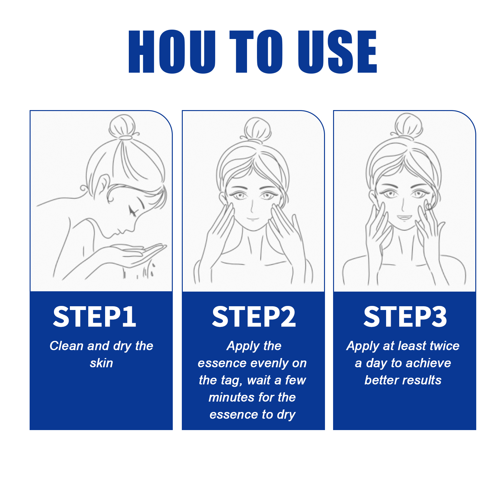 我们的克疣精华素含有透明质酸,积雪草提取物。它可以释放活性成分到皮肤深处,以帮助减少痣,皮肤标签,油和老年斑。它的使用方法很简单:STEP1,清洁并干燥皮肤。STEP2,将精华液均匀涂抹在标签上,等待几分钟等精华液干。STEP3,每天至少涂抹两次以达到更好的效果。并且不会对皮肤造成刺激,不会在皮肤标签、痣或疣脱落时留下疤痕。