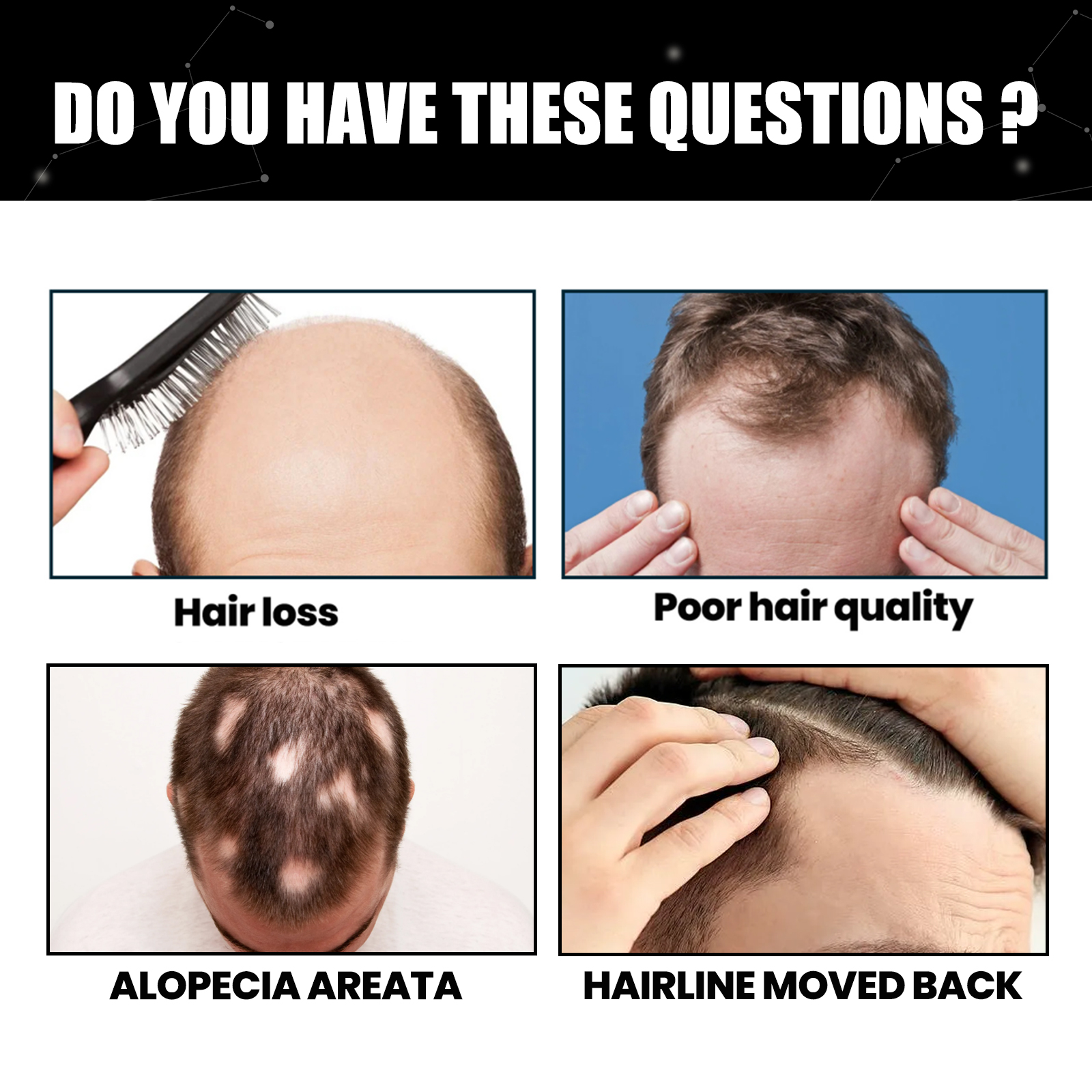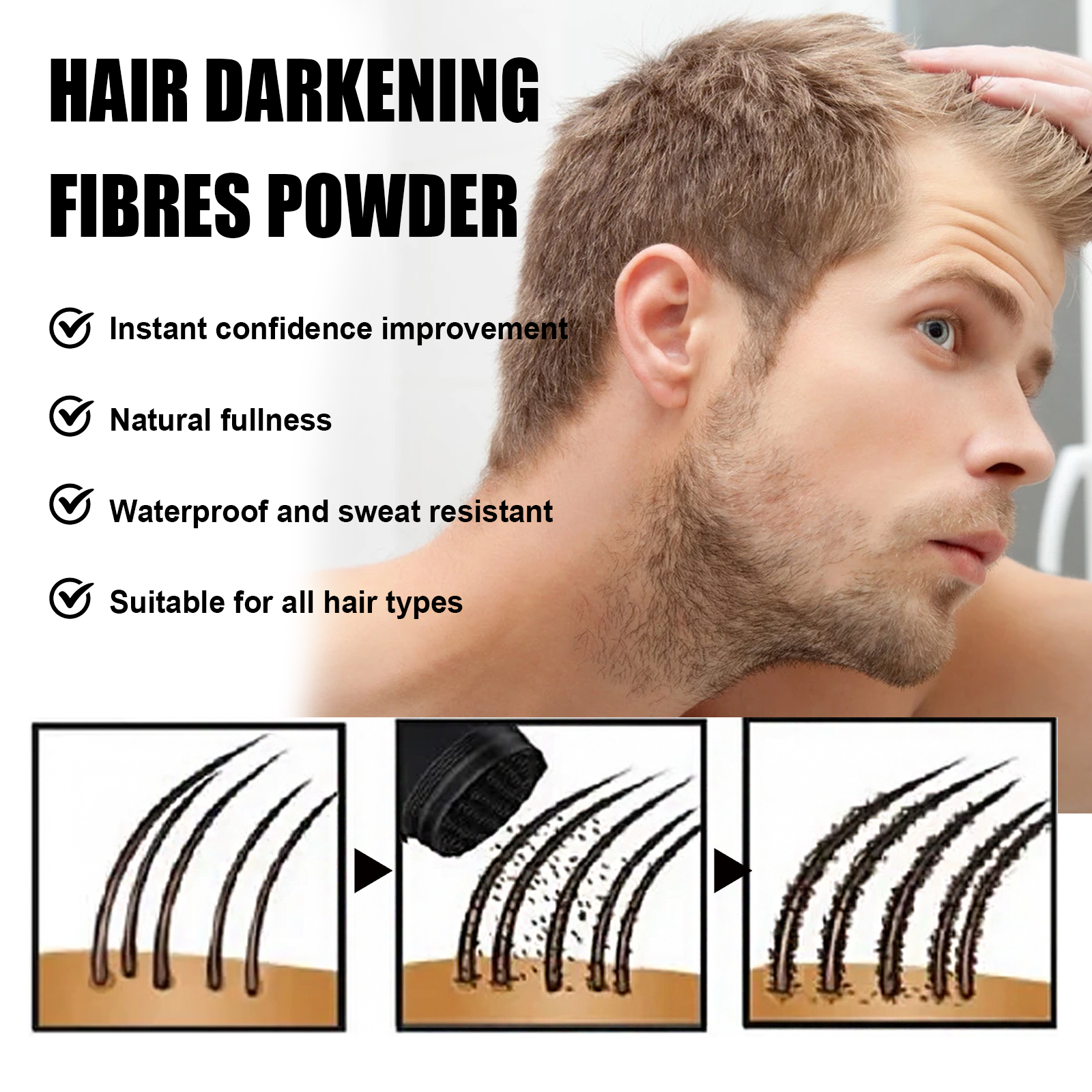 我们的头发纤维粉,由改性玉米淀粉、淀粉辛烯基琥珀酸铝精心调配而成。专为让头发增粗纤维提供立竿见影的效果,毫不费力地覆盖秃顶部位、稀疏区域和斑块设计。使用方法极为便捷:1.清洁头发并吹干,选择与头发颜色相匹配的粉末。2.用梳子整理头发,区分需要加厚的头发区域。3.按1-2泵的粉末,喷在头发少发的地方。4.最后,根据需要完成头发造型。并且可以覆盖你稀疏的头发和太阳穴、发际线顶部和其他区域的秃点,创造更厚更饱满的效果。