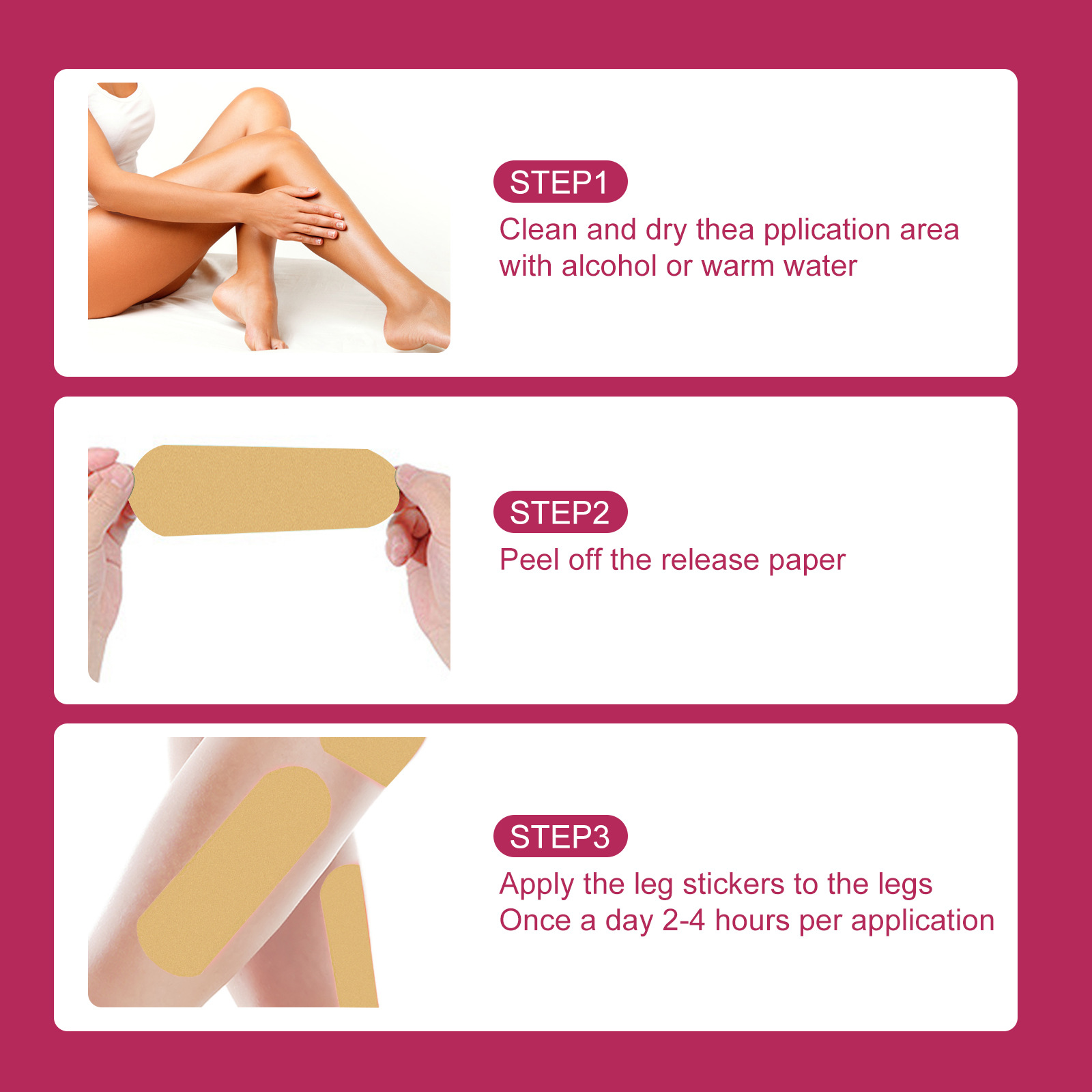 我们的生姜美腿贴含有生姜。它可以腿部肌肉软化,腿细的效果。它的使用方法很简单:1.用酒精或温水清洁和干燥涂抹区域;2.剥去脱模纸;3.将腿贴贴在腿上,每天一次,每次2-4小时。生姜美腿贴提拉塑形腿部,紧致大腿肌肉,塑造美腿。