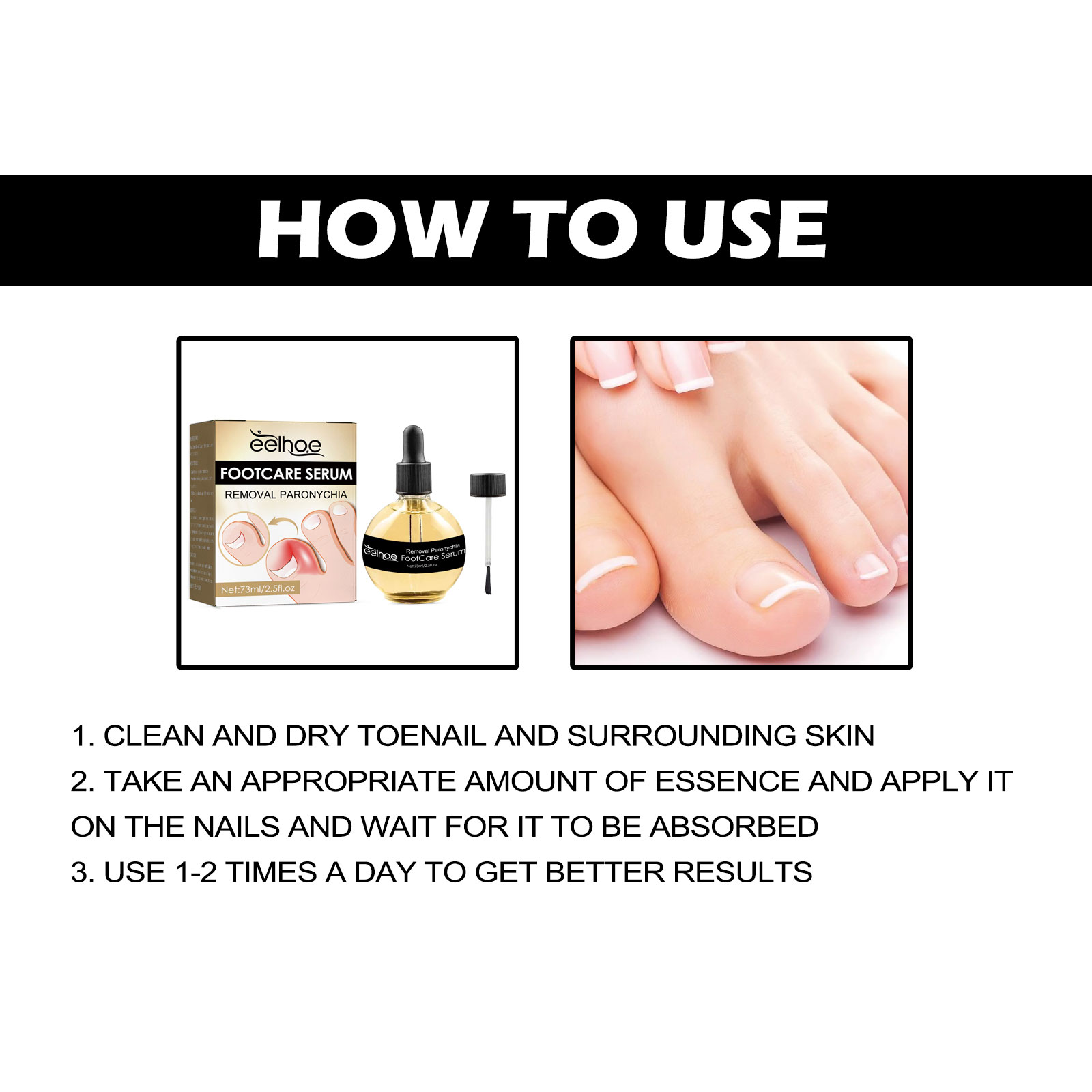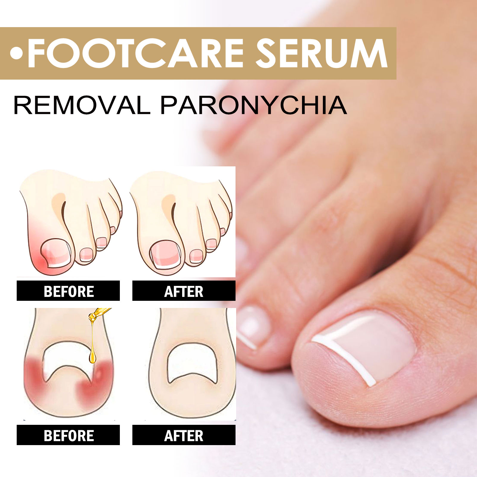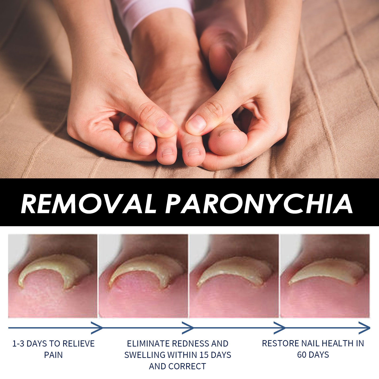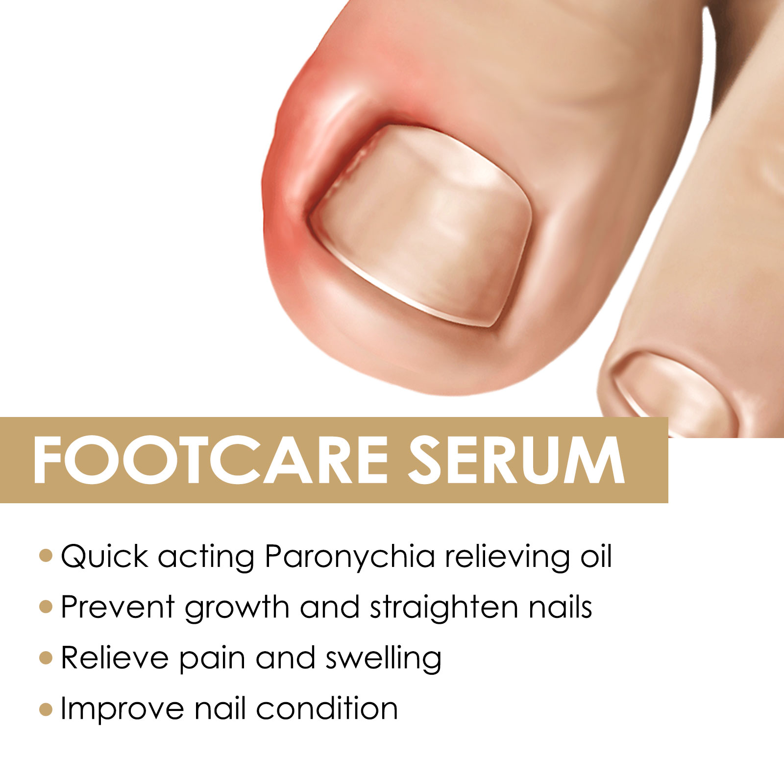 我们的抗甲沟精华含有维生素E、乳木果油、丁香油。它可以速效甲沟炎缓解油,防止指甲生长和拉直指甲,缓解疼痛和肿胀,改善指甲状况。它的使用方法很简单:1. 清洁并擦干脚趾甲及周围皮肤;2. 取适量精华液涂于指甲上,待其完全吸收;3.每天使用1-2次可以获得更好的效果。抗甲沟精华有效去除甲沟炎,使用简单方便。