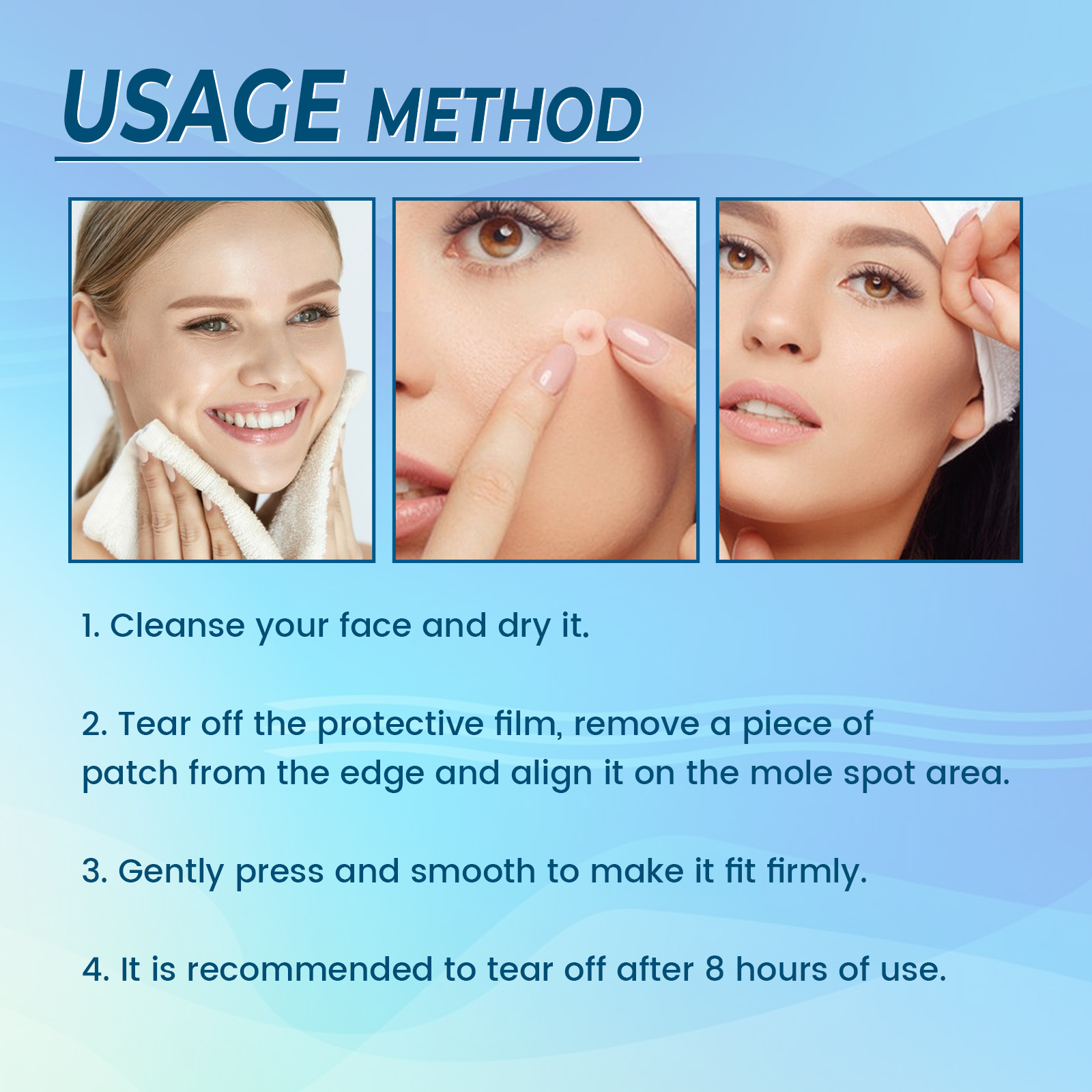 我们的消痣贴含有侧柏提取物、金黄洋甘菊提取物、生育酚(维生素E)。它可以深层滋养肌肤,覆盖皮赘,减少痣,改善皮肤外观。它的使用方法很简单:1. 清洁面部并擦干。2. 撕下保护膜,从边缘取下一块贴片,对准痣斑区域。3. 轻轻按压和平滑,使其牢固。4. 建议使用8小时后撕掉。消痣贴软化浅层皮肤,持续触发HPV细胞消除,快速渗透,修复问题皮肤。