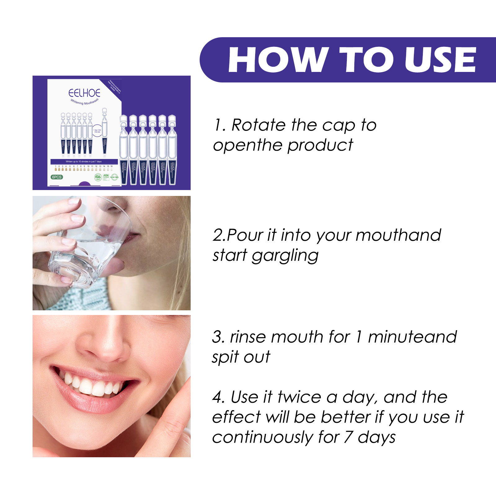 我们的焕白漱口水含有木糖醇、薄荷油、甘油。它可以深入牙釉质,分解沉积在牙齿上的色素,使牙齿由内而外变白。它的使用方法很简单:1. 旋转瓶盖打开产品;2.把它倒进嘴里,然后开始漱口;3. 漱口1分钟,然后吐出来;4. 每天使用两次,连续使用7天效果会更好。焕白漱口水全面美白牙齿,缓解口腔异味,持久的新鲜感,保护牙龈和牙齿。