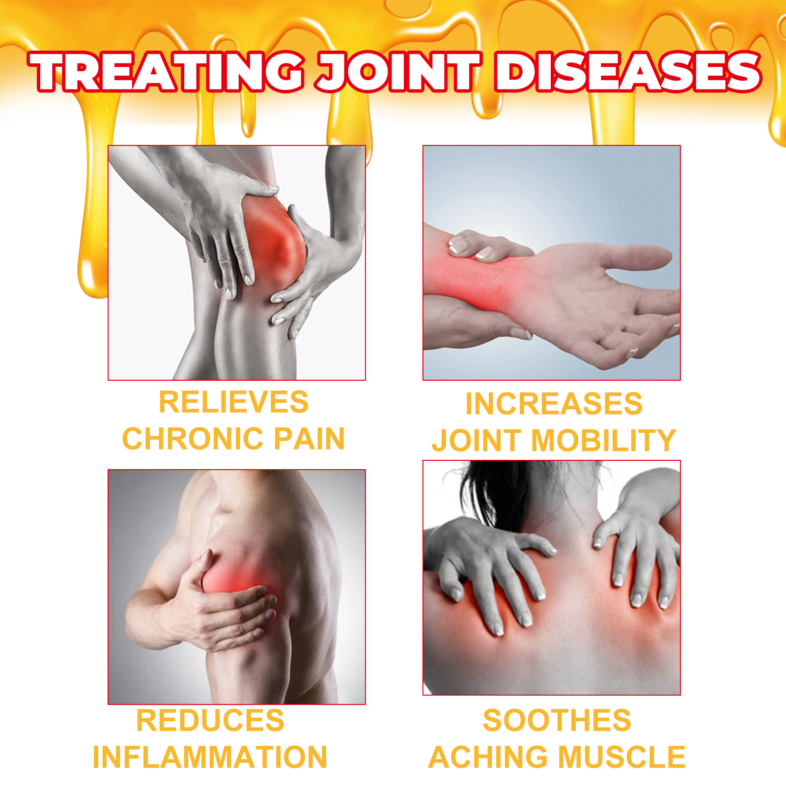 我们的蜂毒关节护理霜含有决明子花提取物、氨基葡萄糖。它可以快速吸收,快速缓解疼痛精心配方,深入肌肤促进关节健康和关节活动度,可能有助于提高关节的灵活性和灵活性。它的使用方法很简单:1.清洁和干燥疼痛关节上的皮肤。2.取适量本品均匀涂于肌肤上。3.轻轻按摩,用手打圈均匀吸收。并且可以促进血液循环,从而帮助深层镇痛,减少肌肉僵硬。