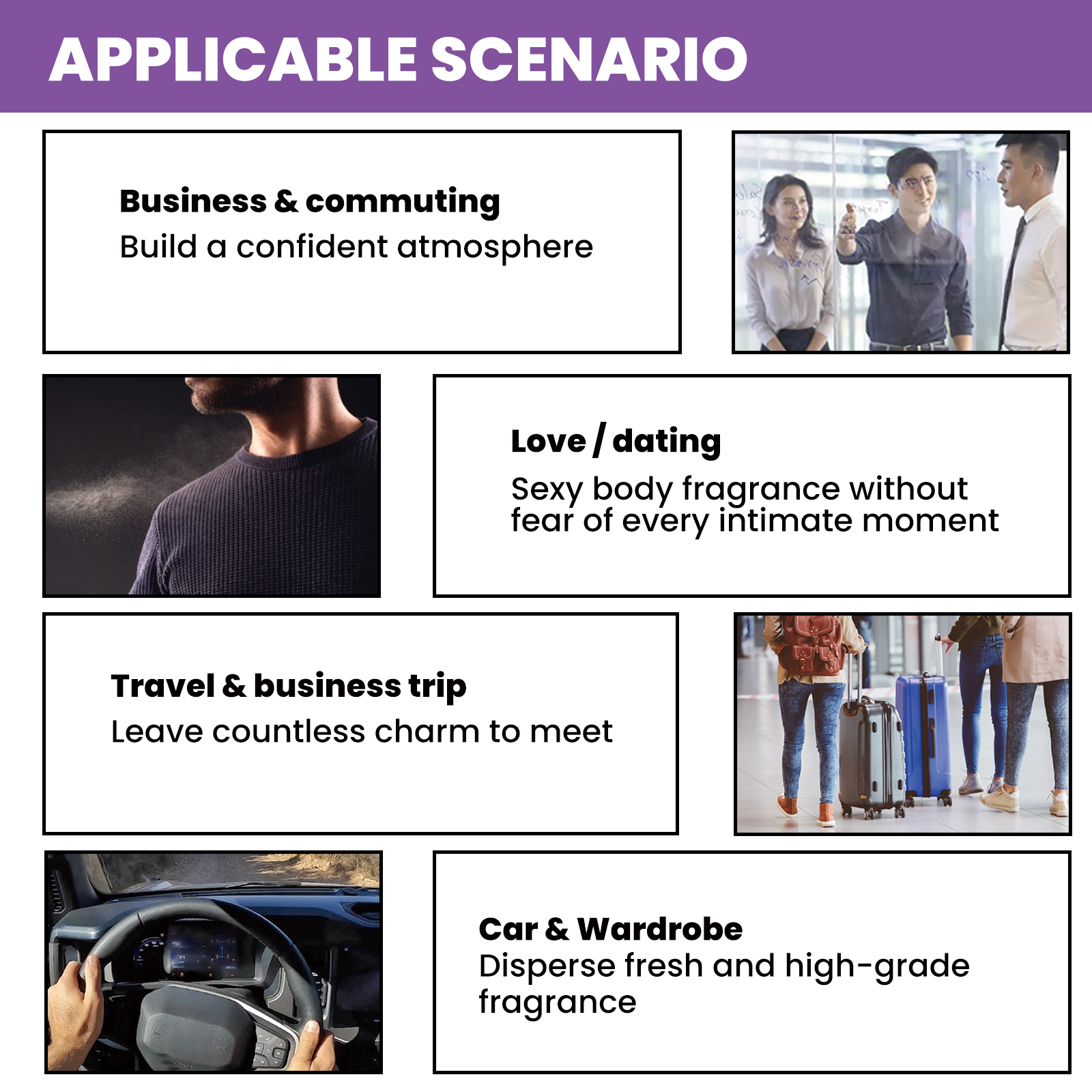 我们的身体护理喷雾含有达米阿那叶提取物、淫羊藿提取物、玛卡根提取物。它可以分散清新高档的香味。它的使用方法很简单:1.滴几滴喷雾,按摩颈部和肩部。或者在香薰扩散器里喷点喷雾。2.让它发挥它的魔力,并有一个约5-10分钟的对话,以加深连接。3.陶醉在迷人的效果中,在幸福的亲密中变得更亲近。并且性感的体香无惧每一个亲密时刻。