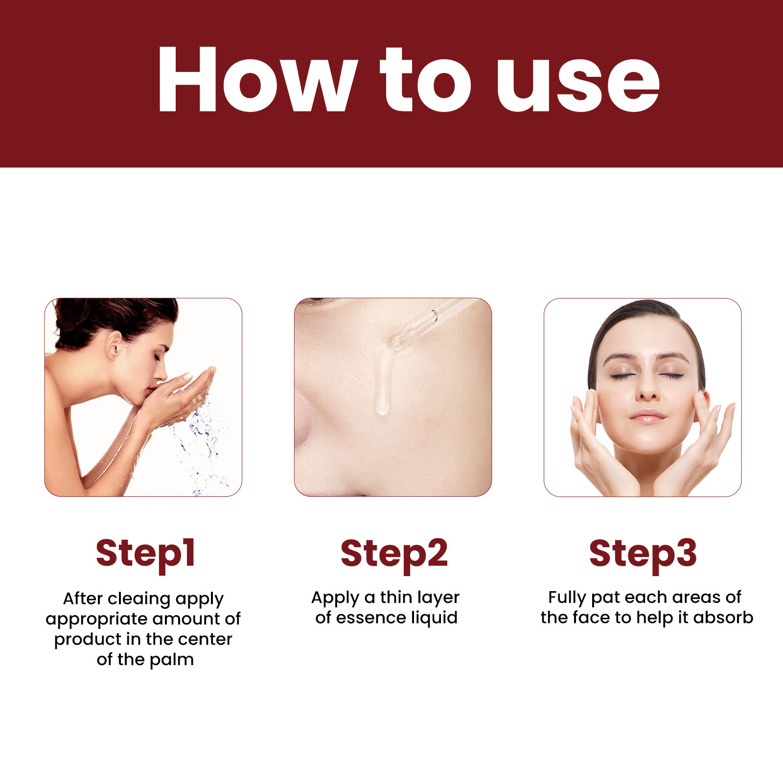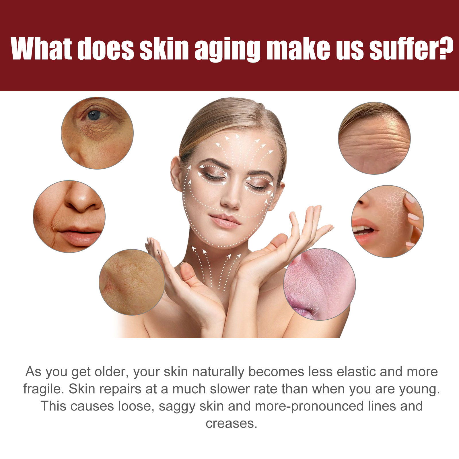 我们的防衰老精华液含有透明质酸、胶原、甘油。它可以为皮肤提供深层营养和水分,刺激细胞中新胶原蛋白的产生,使皮肤紧致明亮,看起来更年轻,更健康。减少炎症和色素沉着,改善皮肤质地,弹性和紧致度,减少细纹和皱纹,抵抗衰老迹象。适用于各种肤质的人,能解决深层皱纹、暗黄皮肤、松弛下垂等问题。它的使用方法很简单:1.洁面后,取适量本品于掌心;2.涂抹一层薄薄的精华液;3.充分拍打面部的每个区域,以帮助吸收。刺激细胞内新胶原蛋白的产生,使皮肤更紧致,看起来更年轻、更健康。