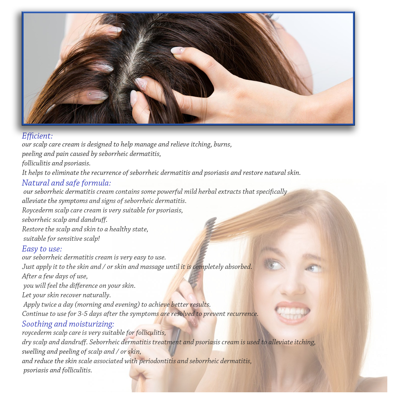 我们的皮肤护理膏含有矿油、甘油硬脂酸酯、卡波姆。它可以特别缓解脂溢性皮炎的症状和体征。它的使用方法很简单:1.先用温水清洗患处,擦干。2.取少量以打圈的方式涂于问题部位3分钟,直至皮肤吸收面霜,每日2-3次,效果最佳。3.症状缓解后继续使用3-5天,以防止复发。并且可以适合牛皮癣,脂溢性头皮和头皮屑。使头皮和皮肤恢复到健康状态,适合敏感的头皮!
