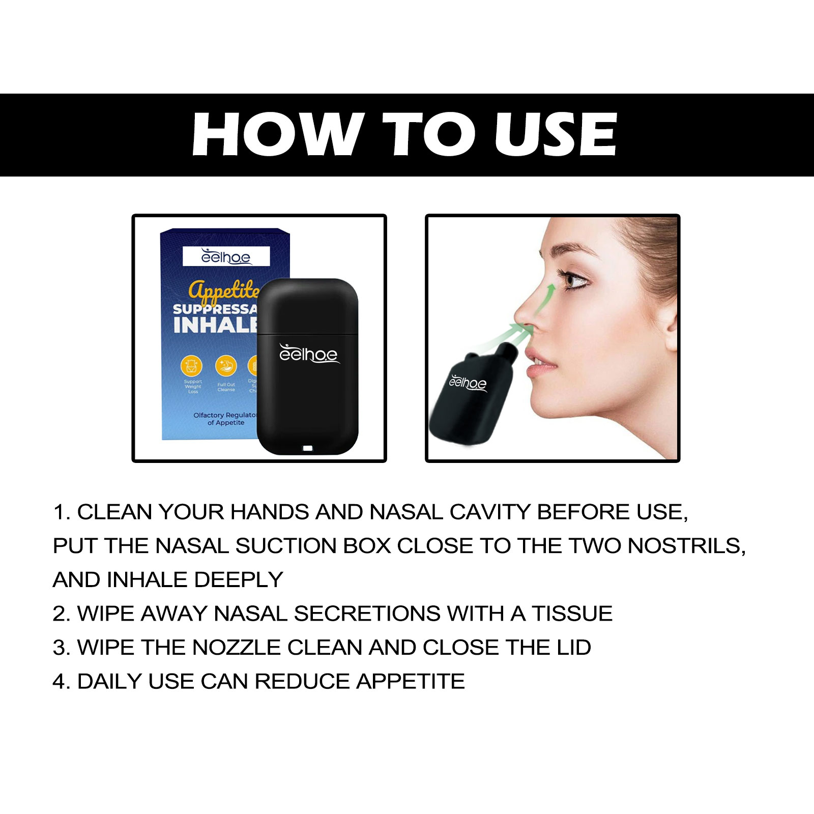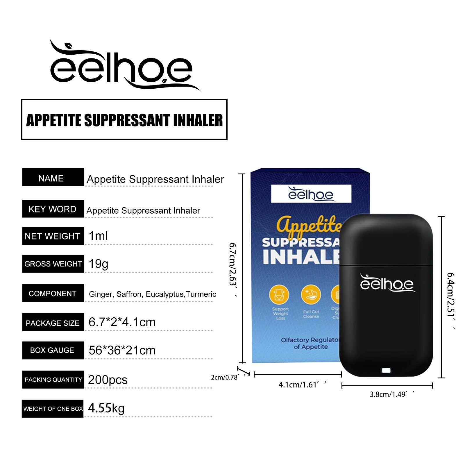 我们的鼻腔吸入器含有生姜、藏红花、桉树油。它可以有效抑制食欲,让您轻松消除多余的脂肪堆积。它的使用方法很简单:使用前先清洁双手和鼻腔,将吸鼻盒靠近两鼻孔,深吸,用纸巾擦去鼻分泌物,最后将喷嘴擦干净并盖上盖子即可,每日使用可降低食欲。让您比以往任何时候都更快实现您的减肥目标。