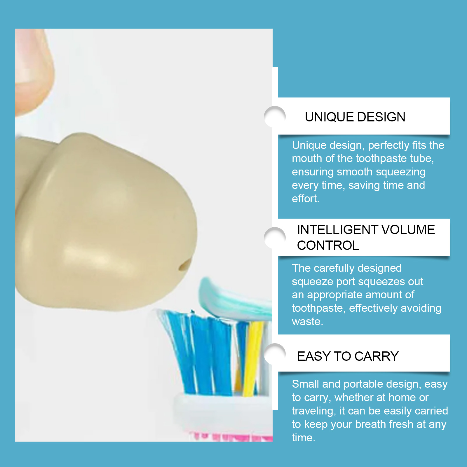 我们的牙膏分配头套含有橡胶。它可以避免牙膏与手指和空气接触,有效防止交又污染,1保持口腔清洁健康。它的使用方法很简单:取下牙膏管原来的盖子后,将分配盖拧到牙膏嘴上,确保它紧贴牙膏嘴。使用者可按下牙膏管从出胶帽口挤出适量牙膏,享受独特的刷牙体验。并且更换方便,方便实用,使您的生活更加方便。