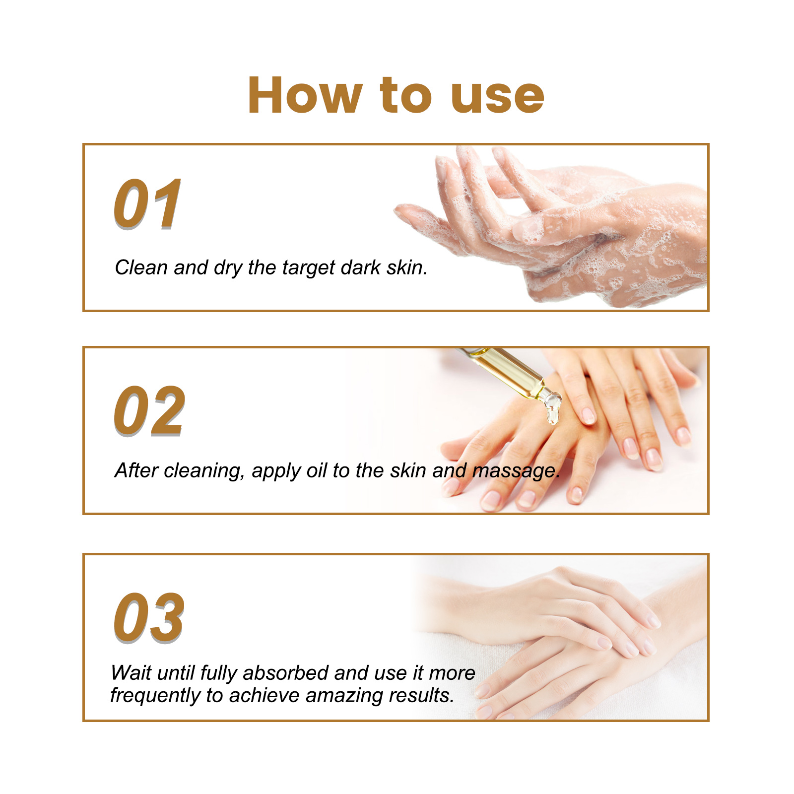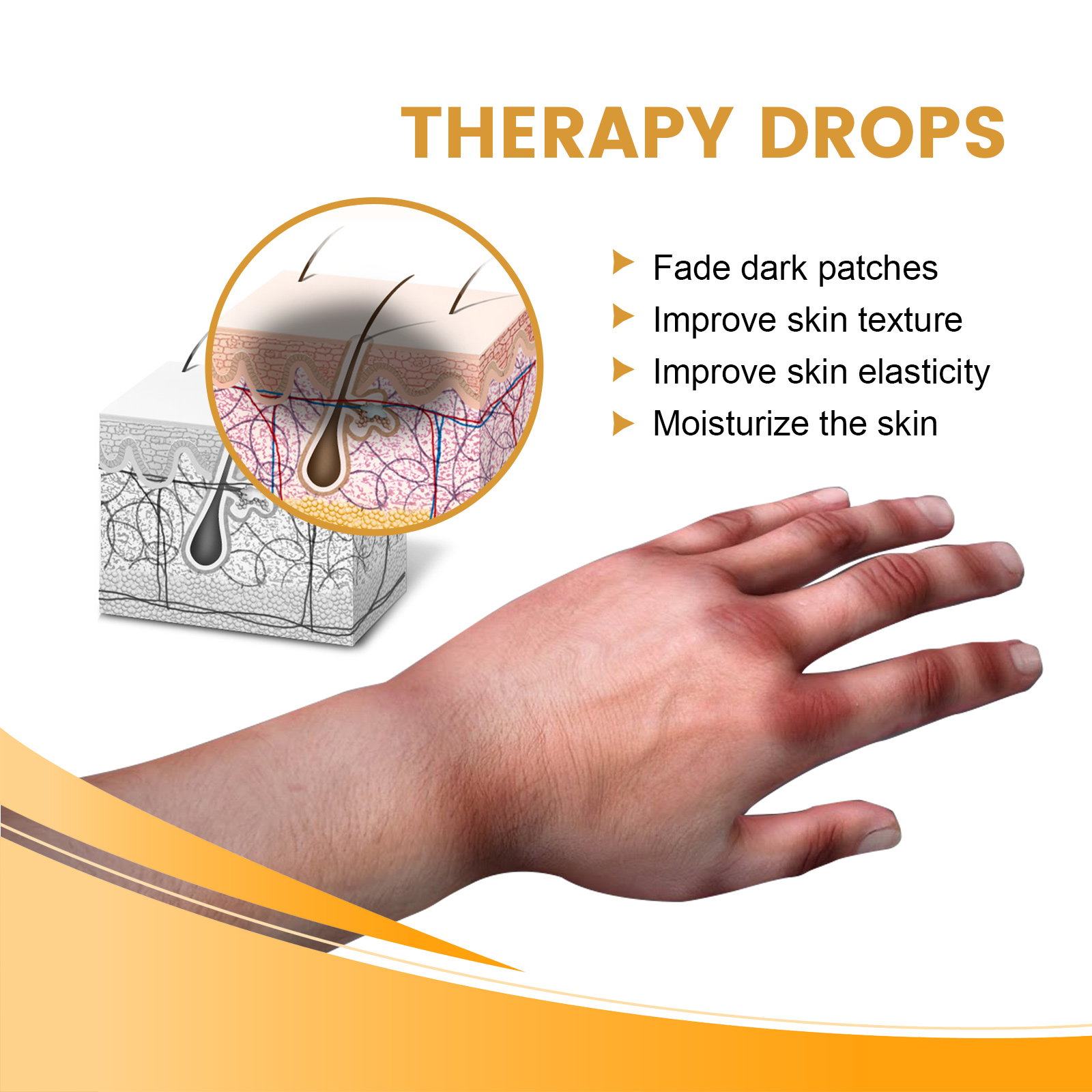 我们的指关节黑棘皮精华含有烟酰胺,甘油,尿囊素。它可以消除深色色素沉着,滋润皮肤,抚慰皮肤瘙痒的症状,改善皮肤质地,有效治疗黑色素增加导致更深的皮肤色素沉着,帮助滋润和滋养皮肤,从而减少干燥和色素沉着,使皮肤看起来更健康,肤色更均匀。去角质可以通过去除表层的死皮细胞来帮助淡化暗沉的皮肤,死皮细胞会导致暗沉或肤色不均。它的使用方法很简单:清洁并擦干深色皮肤,清洁后,在皮肤上涂油并按摩,等到完全吸收后,更频繁地使用,可以达到惊人的效果。淡化暗斑,改善肤质,改善皮肤弹性,滋润肌肤,淡化皮肤黑色素,帮助提亮肤色,薄化受损皮肤。