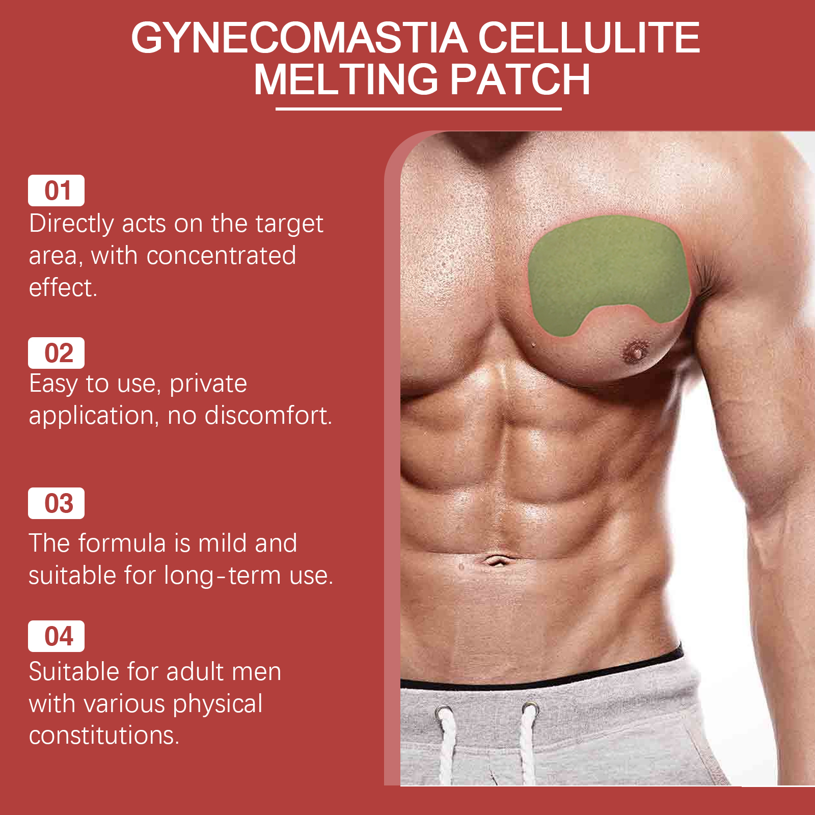 我们的男性乳房护理贴含有生姜根提取物、红花花提取物、川芎根提取物。它可以有助于减少胸部的局部脂肪堆积,从而减轻男性乳房发育症的症状。有助于紧致乳房,消除脂肪团,使乳房保持健康。它的使用方法很简单:1.清洁胸部皮肤,保持干燥。2.取适量颈霜均匀涂抹于肌肤;3.轻轻按摩至颈部吸收。男性乳房护理贴使用方便,只需贴在胸前,无需任何技能,节省您的时间和精力。有助于改善外表,增强社交信心。专为男性体型设计,专注于改善乳房发育问题。成份温和,感觉温和,使用有效。长效释放有效成分,持续数小时。