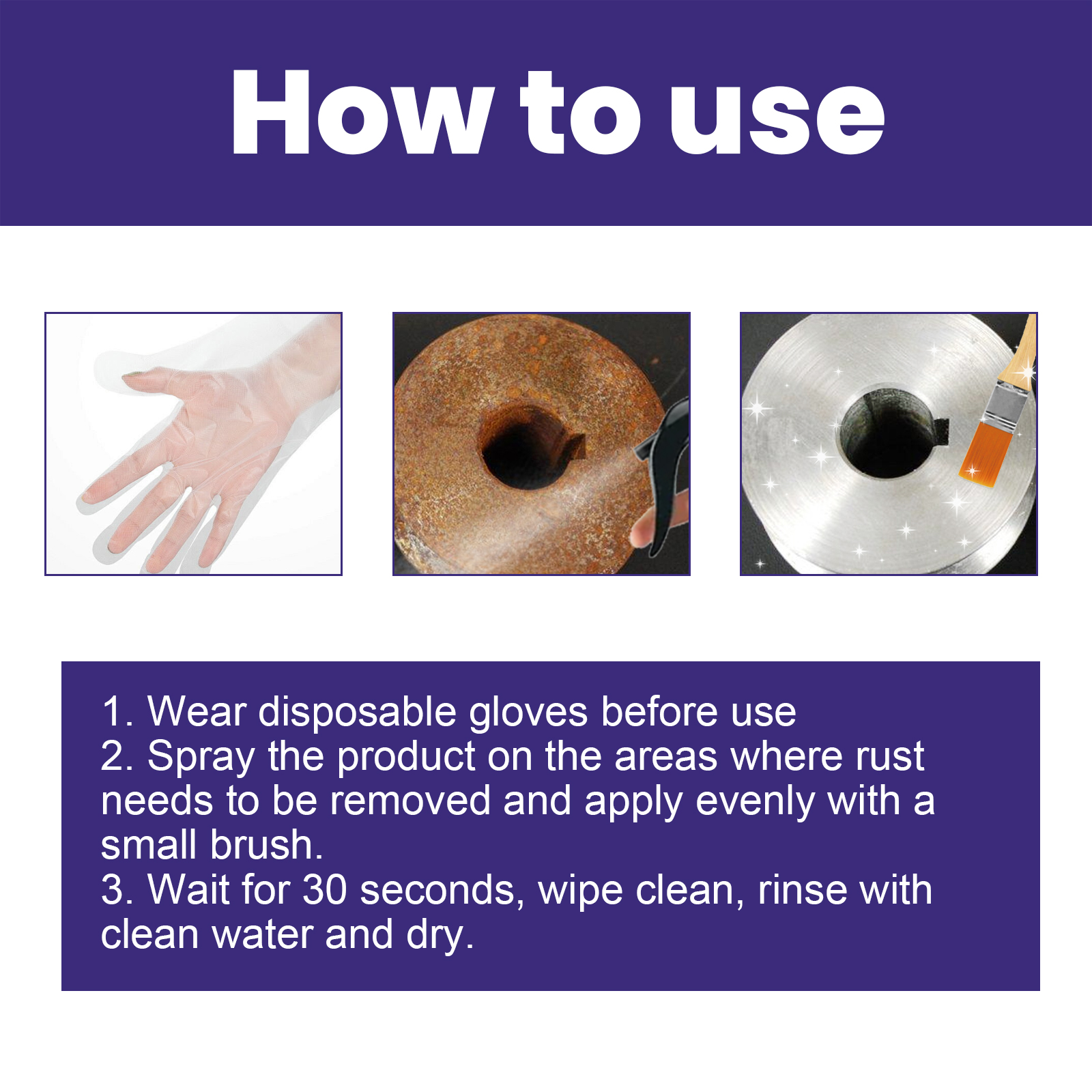 我们的金属除锈喷剂含有柠檬酸、葡萄糖酸钠。它可以强度分解采用特殊配方,能快速去除金属氧化物,长效保护,能形成致密的保护膜,长期防止污渍的再氧化。它的使用方法很简单:1.使用前戴上一次性手套2.将本品喷在需要除锈的地方,用小刷子均匀涂抹。3.等待30秒,擦干净,用清水冲洗干净,晾干。并且不会伤害金属,不会对金属造成腐蚀或引发化学反应。