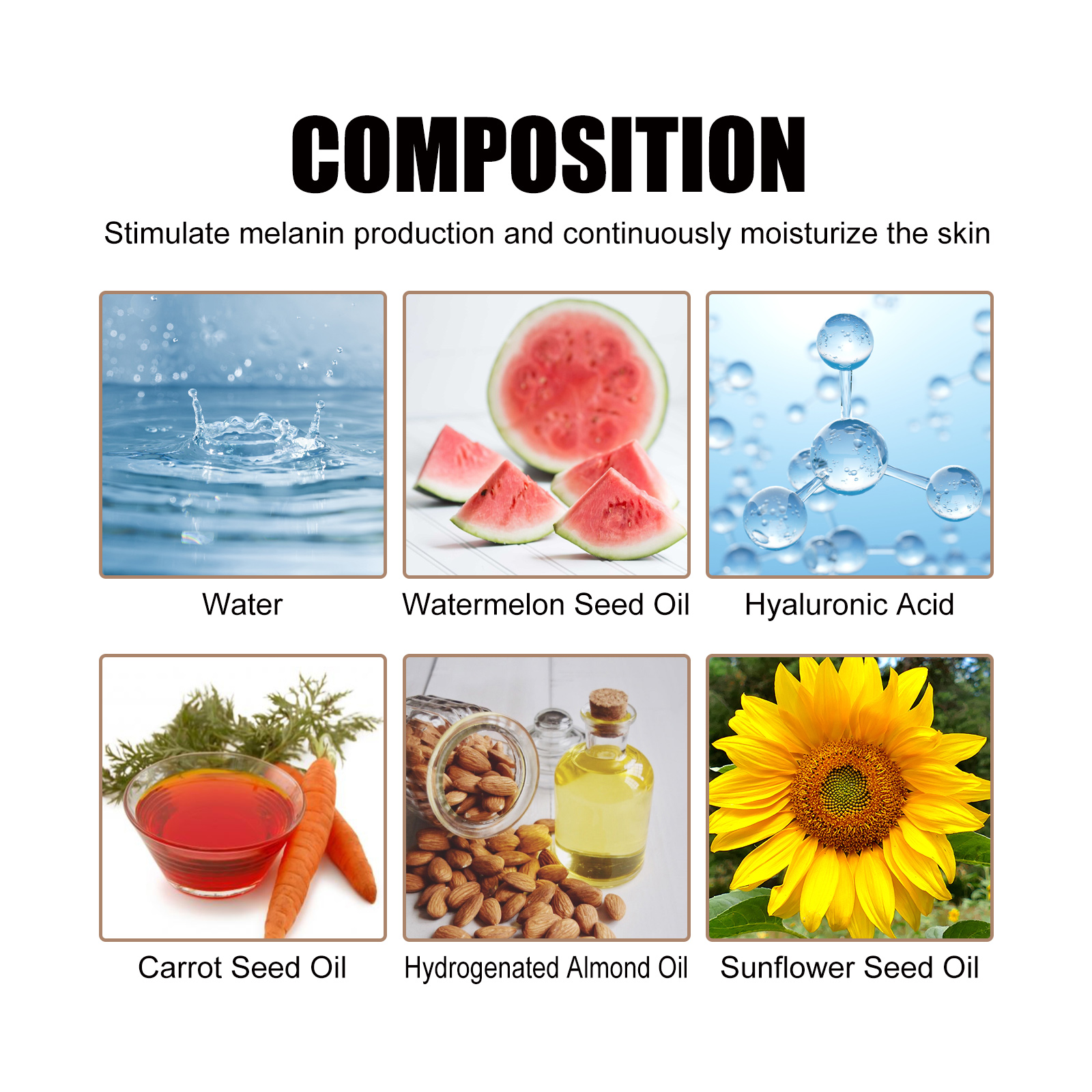 我们的助黑喷雾含有西瓜籽油、 透明质酸,胡萝卜籽油。它可以帮助您快速晒黑,同时在晒黑过程中持续滋润肌肤,提供深层、丰富、容光焕发的晒黑肌肤。它的使用方法很简单:首先在使用前将要使用的部位清洗干净,之后取出喷雾剂,均匀地喷在整个脸部和皮肤上,皮肤在短时间内自然均匀地变暗。建议每天使用一次,直到拥有所需的晒黑肤色为止,使用后滋润和减少皱纹,获得均匀的美黑效果,防止光线引起的皮肤老化,让您拥有美丽的黑色皮肤。