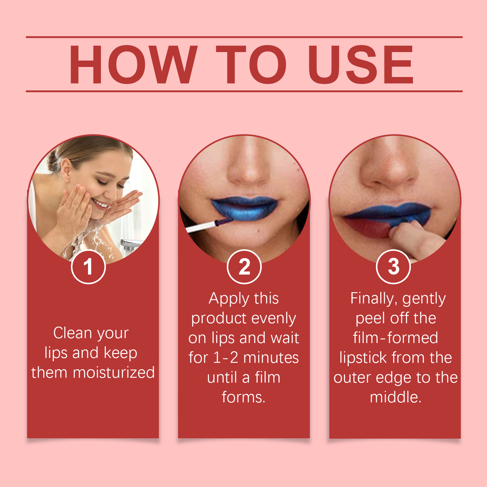 我们的撕拉口红唇釉含有甘油、EDTA 二钠、生育酚(维生素E)。它可以持续保湿,避免干燥保持双唇柔软。它的使用方法很简单:清洁嘴唇,保持湿润,将本品均匀涂于唇部,等待1-2分钟,直至形成薄膜。最后,轻轻地将成膜的口红从外缘到中间剥离。并且细腻的质感,给双唇最好的舒适感。