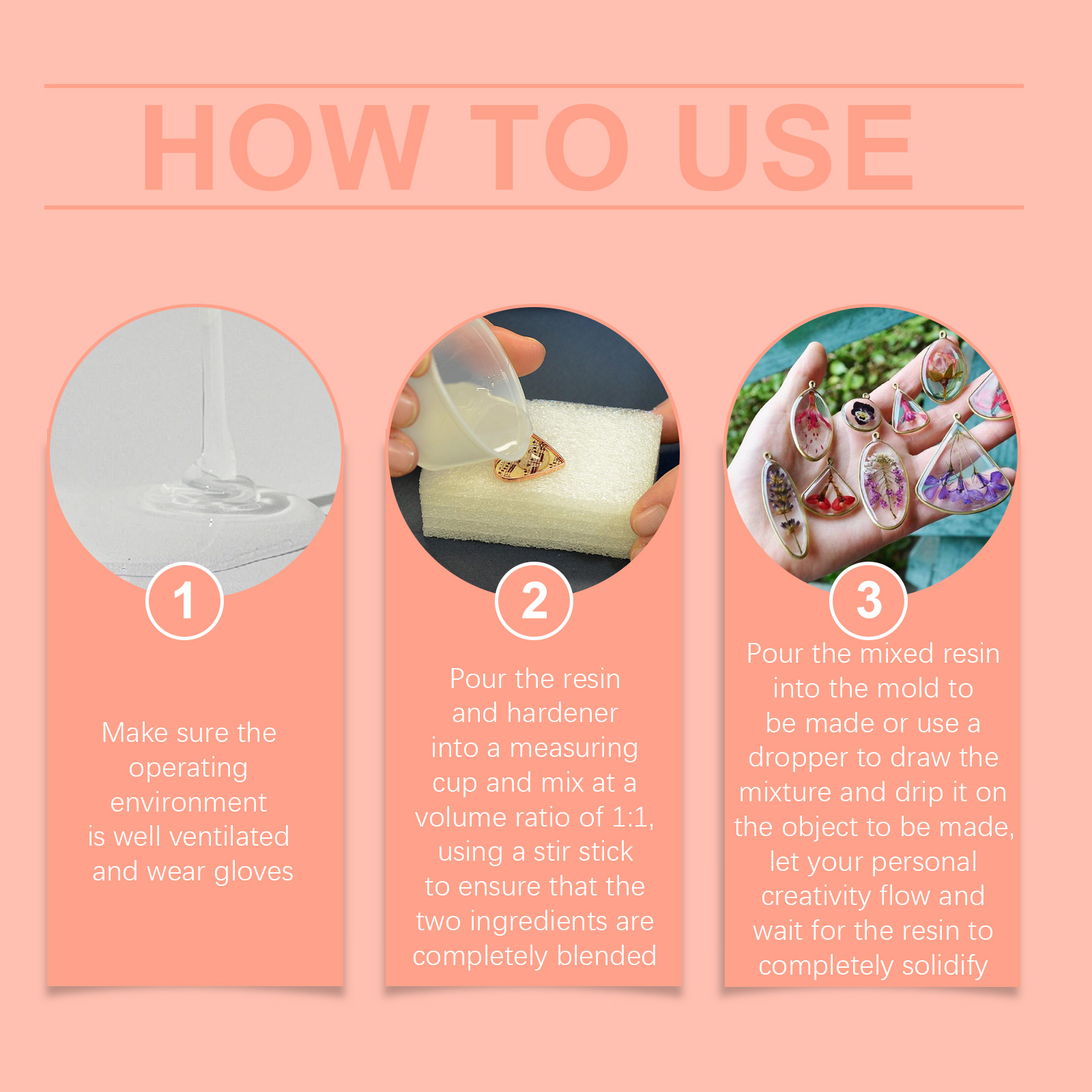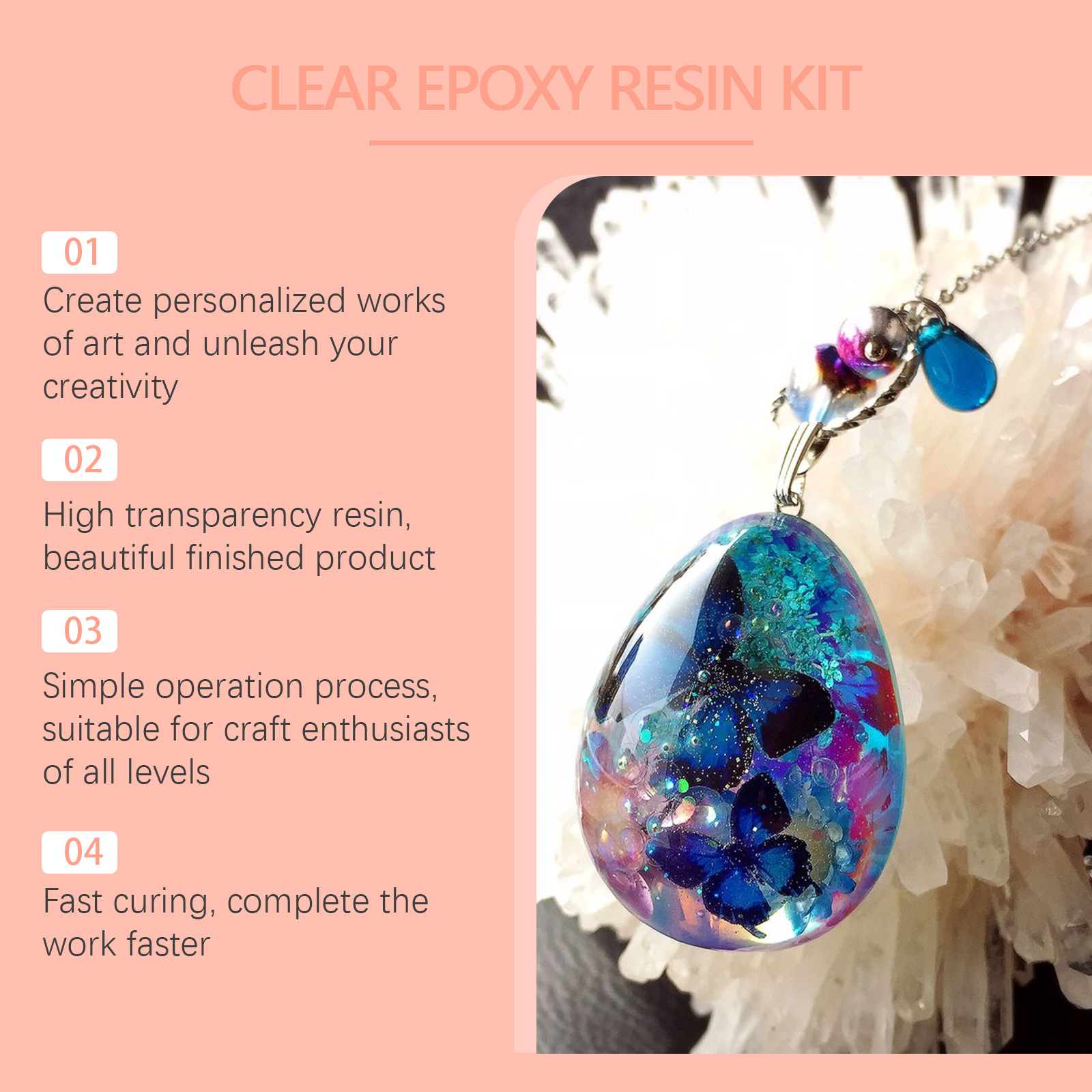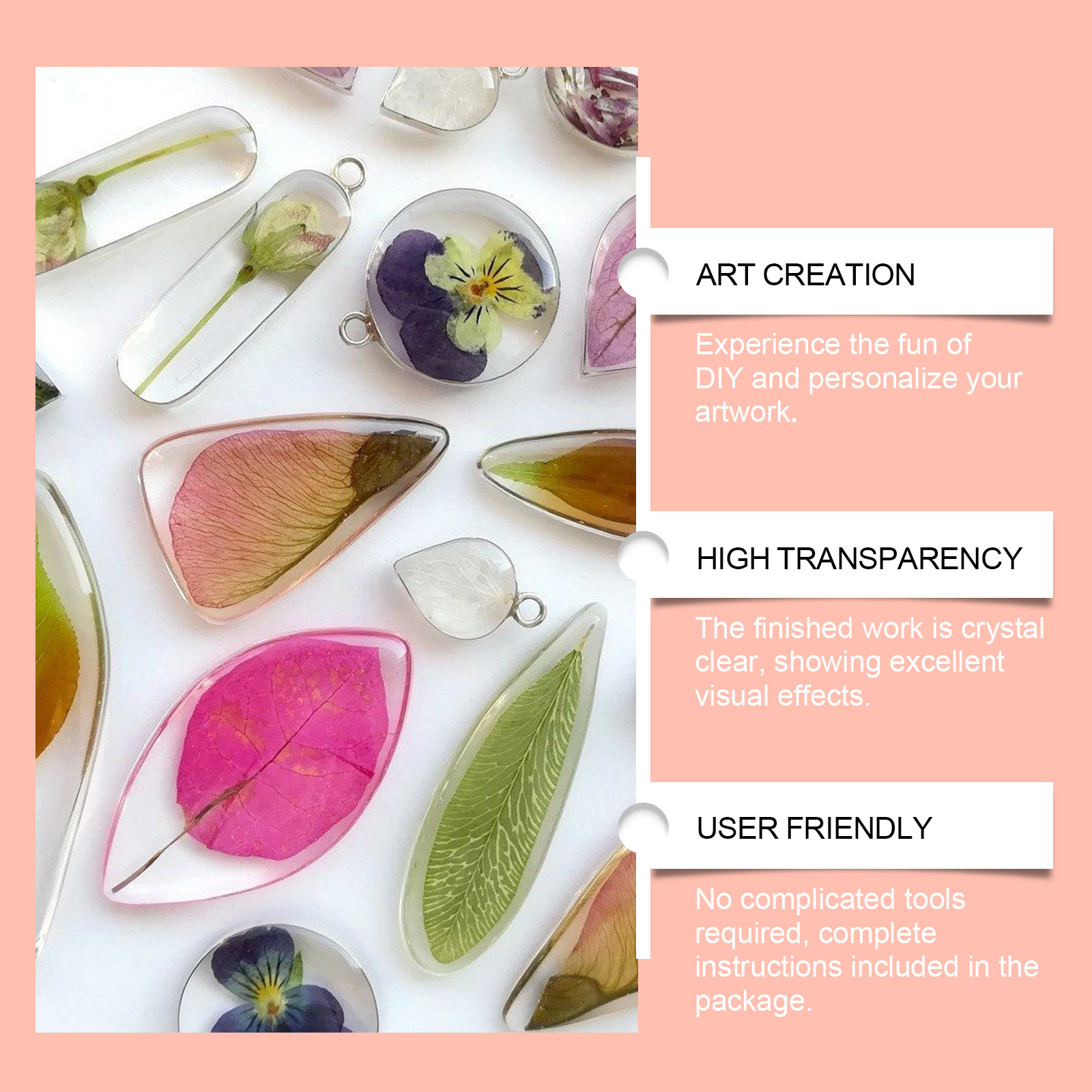 我们的透明环氧树脂套件含有树脂:环氧树脂、聚氨酯树脂、丙烯酸树脂,固化剂:固化剂、促进剂、填充剂。它可以创造个性化的艺术作品,释放您的创造力。它的使用方法很简单:首先确保操作环境通风良好,并佩戴护具,将树脂和硬化剂倒入量杯中,按1:1的体积比混合,使用搅拌棒,确保两种成分完全混合,再将混合好的树脂倒入要制作的模具中,或者用滴管将混合好的树脂滴在要制作的物体上,按您的喜好进行创造,最后等待树脂完全固化即可。可以体验DIY的乐趣,个性化您的艺术作品,操作过程简单,适合各层次的工艺爱好者。