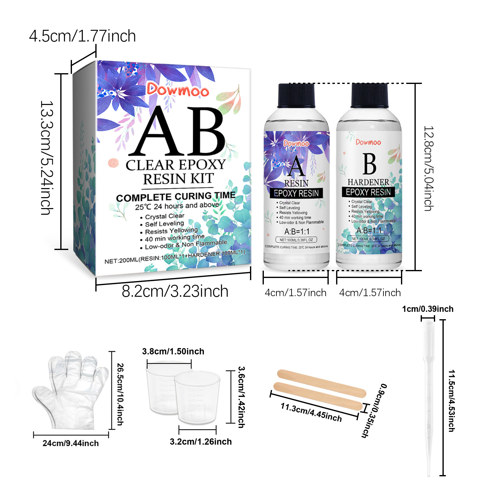 | 产品尺寸 | 树脂:4*4*12.8cm,固化剂:4*4*12.8cm,手套:24*26.5cm,搅拌棒:0.9*11.3cm,量杯:3.8*3.2*3.6cm,滴管:1*11.5cm |