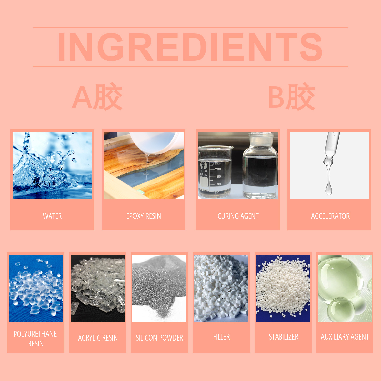 | 成分 | 树脂:环氧树脂、聚氨酯树脂、丙烯酸树脂,固化剂:固化剂、促进剂、填充剂 |