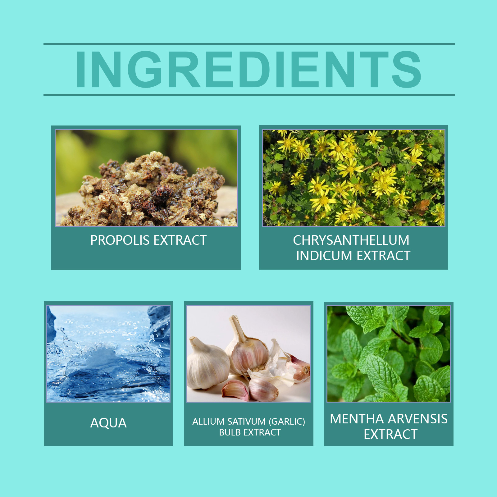 | 成分 | 蜂胶提取物、洋甘菊提取物、大蒜提取物 |