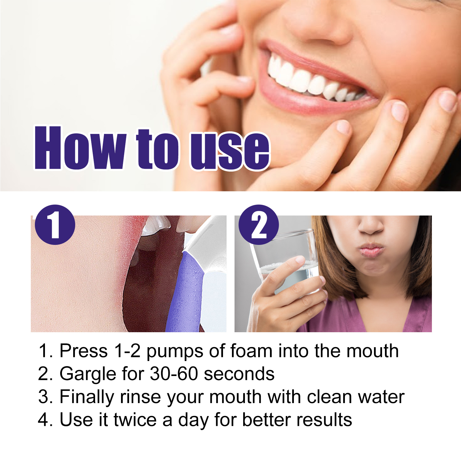 我们的牙龈护理泡沫慕斯含有精氨酸、甘草根提取物、木糖醇。它可以通过抑制炎症过程,缓解发红、肿胀和牙龈不适。有助于防止牙龈进一步受损,促进更健康的口腔环境。它的使用方法很简单:将1-2泵的泡沫压入口中并漱口30-60秒,最后用清水漱口即可,每天使用两次可达最佳效果。支持受损牙龈组织的再生和修复,修复受损的牙龈组织,从而加强牙龈组织的结构和完整性。