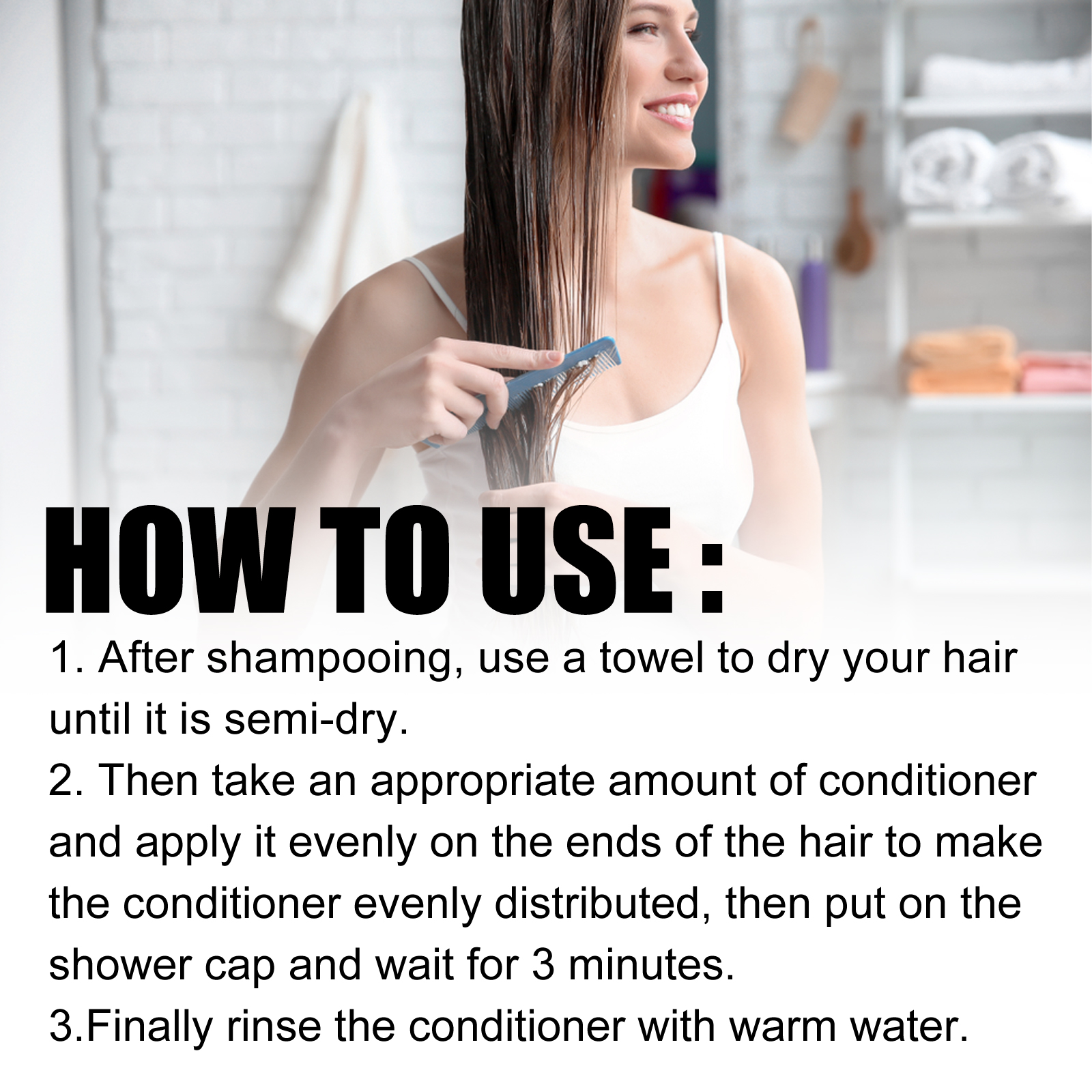 我们的护发素含有西曲氨铵、聚二甲基硅氧烷。它可以帮助软化粗糙的头发,修复内部损伤,并创建强大,有光泽的头发,补充头发的水分和必要的营养成分,使头发柔软有光泽。它的使用方法很简单:洗发后,用毛巾擦干头发,直到头发半干,然后取适量护发素均匀涂抹在发尾,使护发素均匀分布,然后戴上浴帽等待3分钟,最后用温水冲洗干净即可。可以从内而外软化和修复,让头发顺滑,光彩照人。