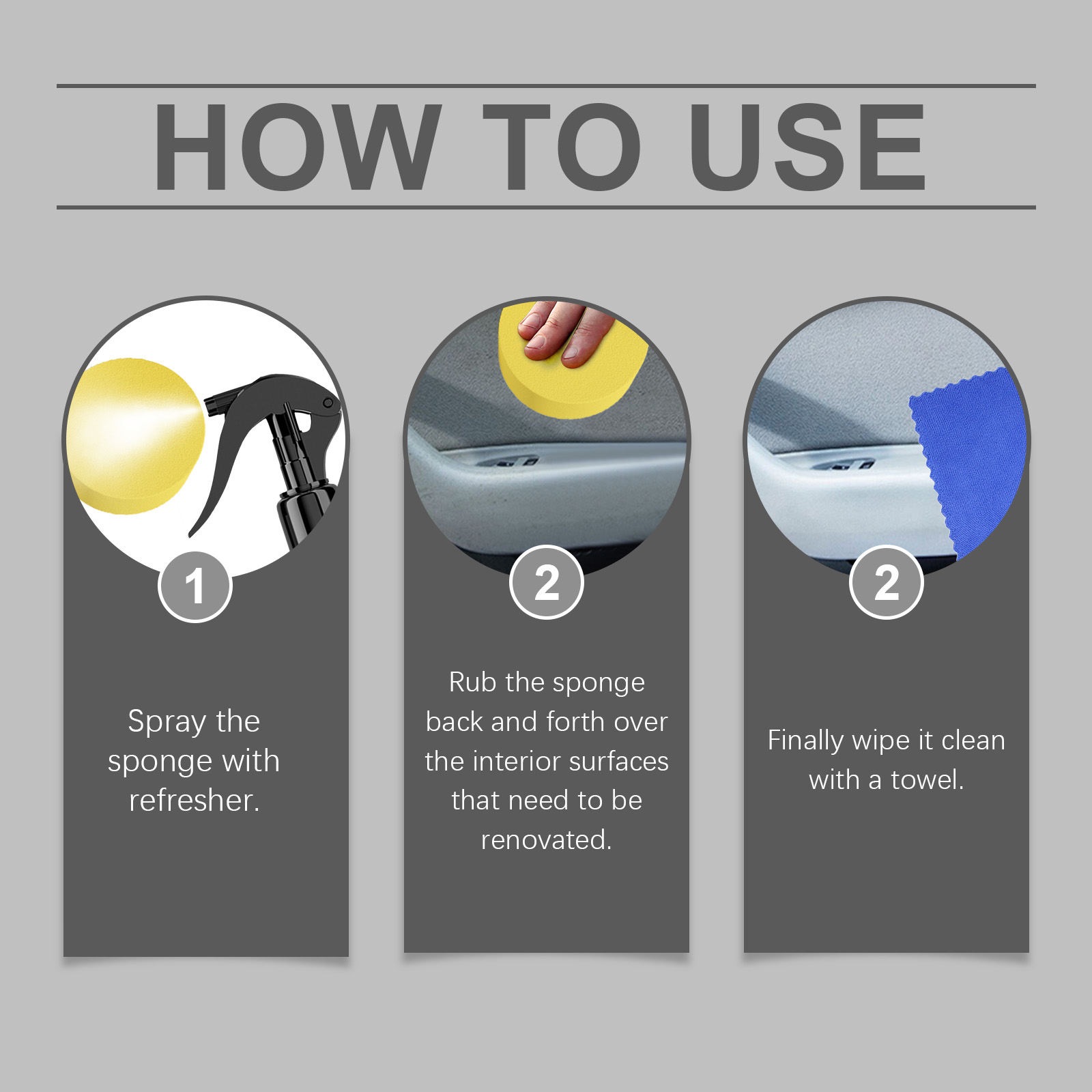我们的多功能汽车内饰翻新剂含有乙二胺四乙酸二钠、碳酸氢钠、羊毛脂。它可以具有强大的去污功能和深层清洁,使您的车内焕然一新。有助于在表面形成隐形涂层,保护内部表面不褪色,开裂和磨损。它的使用方法很简单:1.向海绵上喷洒清新剂。2.在需要翻新的内部表面来回擦拭海绵;3.最后用毛巾擦干净。多功能汽车内饰翻新剂具有螯合作用,能去除金属离子等杂质,提高修复效果。不会伤害你的手,也不会弄脏或腐蚀汽车内饰。
